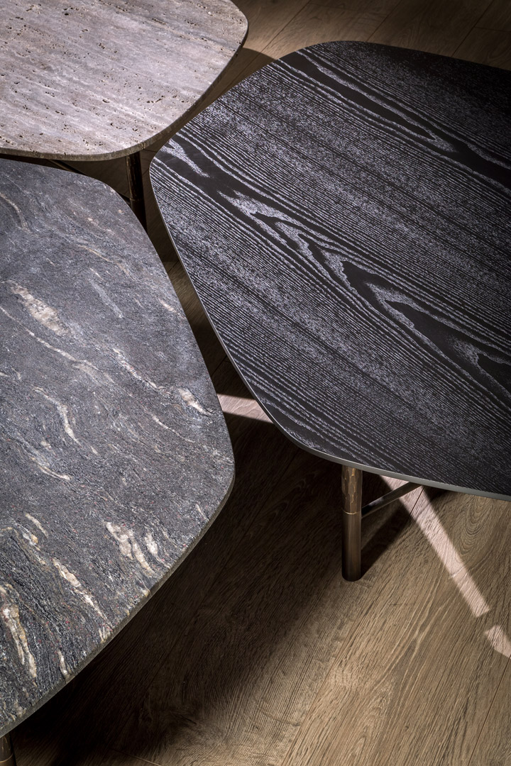 La struttura è in ferro pieno forgiato e il piano è disponibile in pietra, marmo o legno frassino nero e altre essenze. In composizione con altri di materiali diversi crea un interessante movimento nella zona giorno. Il tavolino Shanghai, singolarmente o non, può essere inserito in qualsiasi contesto di raffinata ricercatezza, per un living dal design sofisticato.