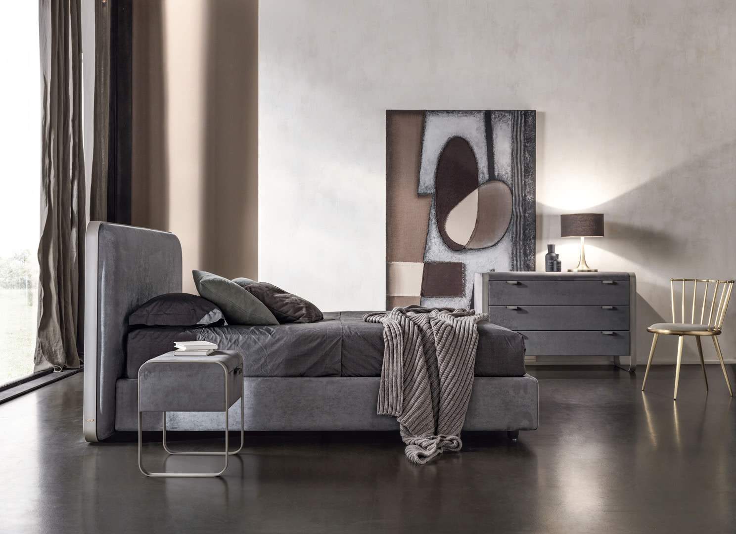 Gli spigoli arrotondati e la cornice sono realizzati in alluminio pieno curvato; la testata e il giroletto sono imbottiti e rivestiti, o impunturati se in pelle, anche in tessuto/pelle fornito dal cliente (il giroletto è sfoderabile). Il letto Elvis, con la sua matrice “streamline” dona un carattere unico alla camera da letto moderna; è disponibile in varie dimensioni per reti da cm: 160x200 (letto matrimoniale), 180x200 (letto matrimoniale) e 200x200 (letto king size) anche nella versione con box contenitore.