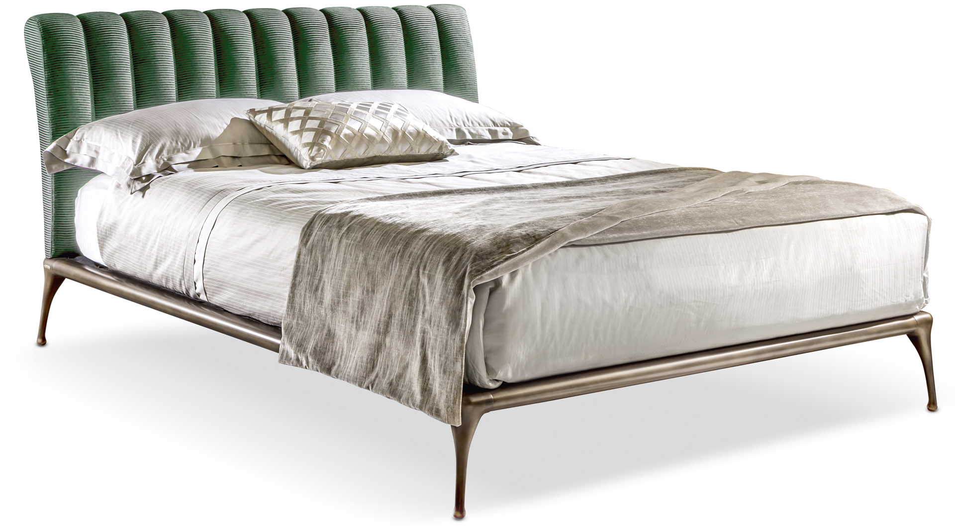 La struttura perimetrale e i piedi sono in fusione di alluminio, decorati in bronzo; la testata imbottita, con trapuntatura verticale, è rivestita con velluto, tessuto, pelle, ecopelle o con tessuto/pelle fornito dal cliente. Un’aura vintage che rende accogliente l’intera camera da letto. Il letto Iseo è disponibile in varie dimensioni per reti da cm: 120x200 (letto da una piazza e mezzo), 140x200 (letto alla francese) e 160x200 (letto matrimoniale).