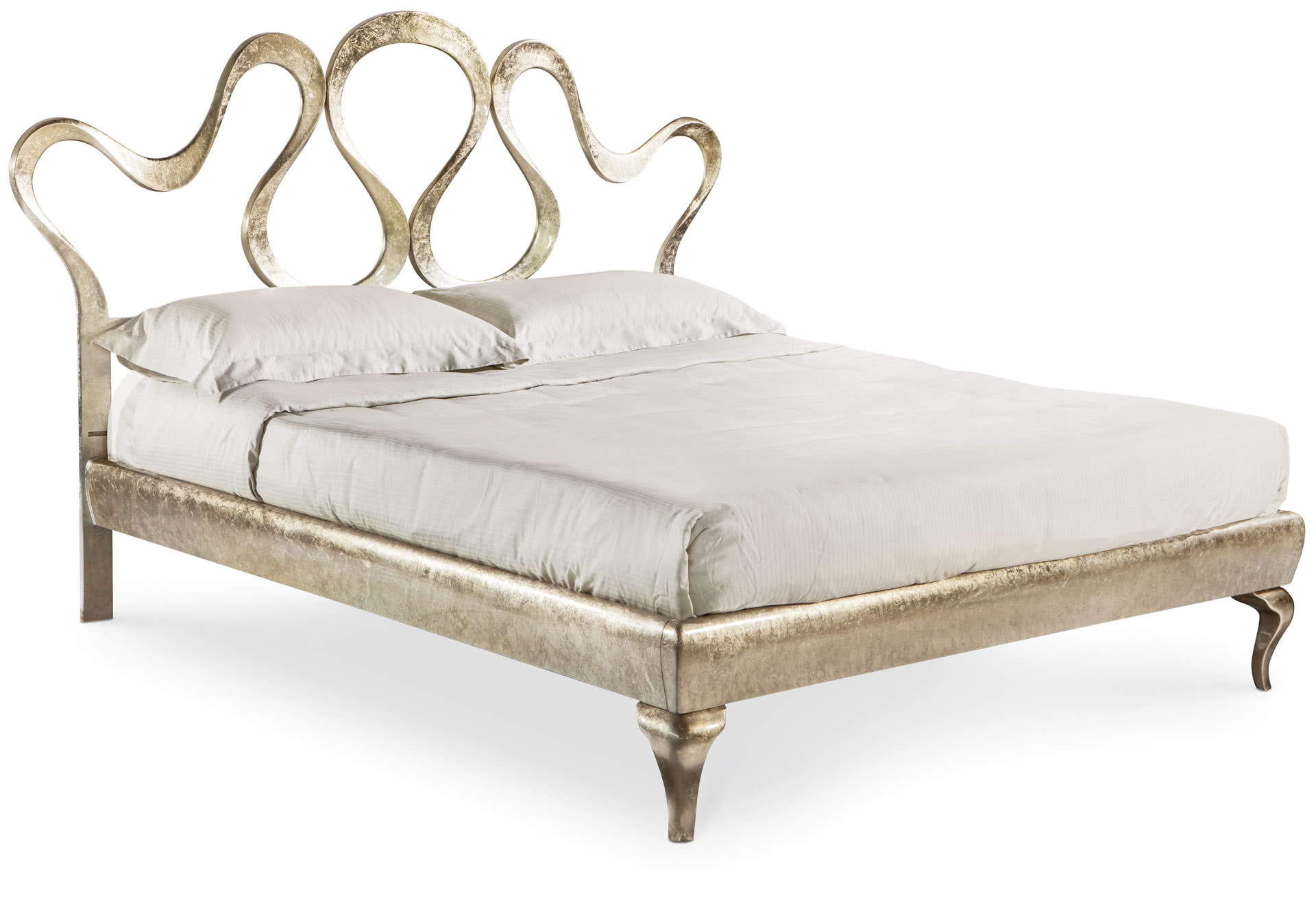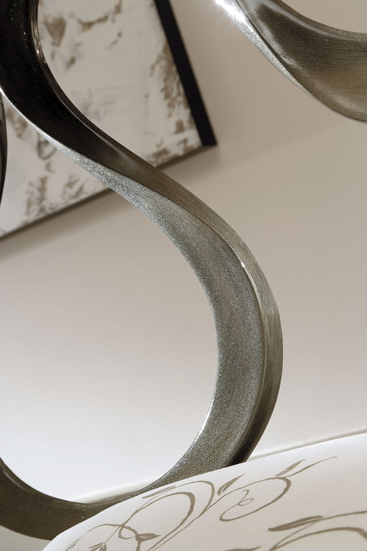 La testata ha un movimento tridimensionale in fusione di alluminio, completamente levigato, lucidato e finito a mano in foglia argento champagne; presenta un pannello imbottito e rivestito all’altezza dell’appoggio del cuscino. Le fasce del giroletto sono realizzate in legno massello sagomato e decorato. Il letto Nastro è perfetto per una camera dal design classico e internazionale; è disponibile in varie dimensioni, con o senza pediera, per reti da cm: 160x200 (letto matrimoniale) e 180x200 (letto matrimoniale) anche nella versione con box contenitore.