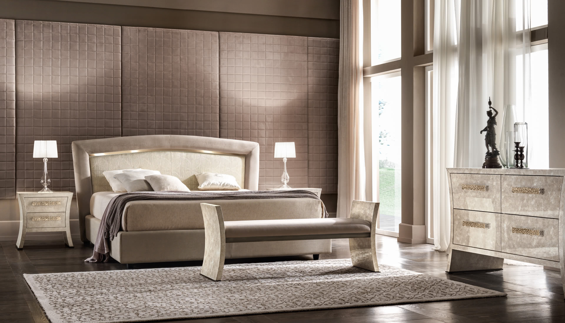 Letto matrimoniale classico Portofino imbottito con dettagli in oro.