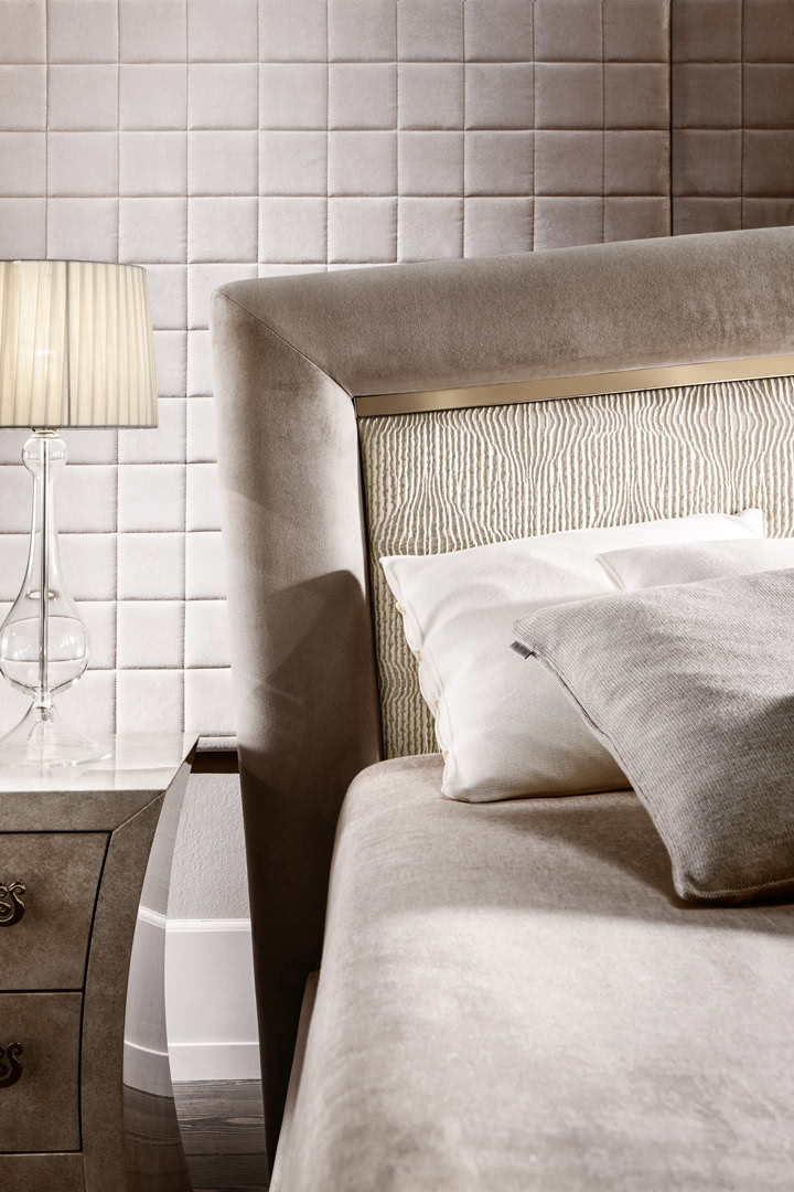 La struttura è imbottita e rivestita, a mano con lavorazione sartoriale, in velluto, tessuto, pelle, ecopelle o con un tessuto fornito dal cliente. Il suo design pulito è impreziosito dal doppio tessuto e dal dettaglio in oro. Il letto Portofino fa da corona ad una camera da letto classica e internazionale; è disponibile in varie dimensioni per reti da cm: 160x200 (letto matrimoniale), 180x200 (letto matrimoniale) e 200x200 (letto king size) anche nella versione con box contenitore.