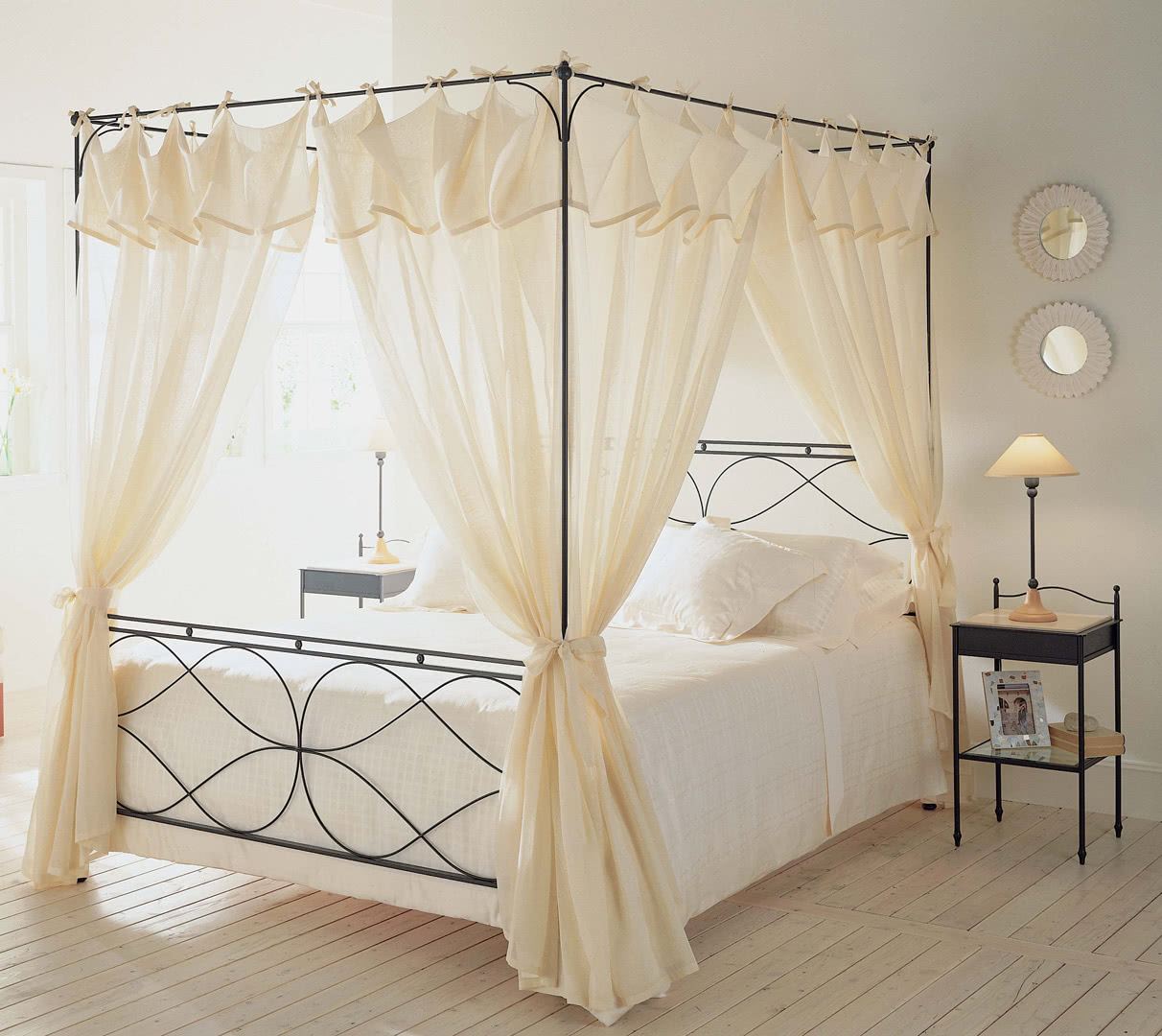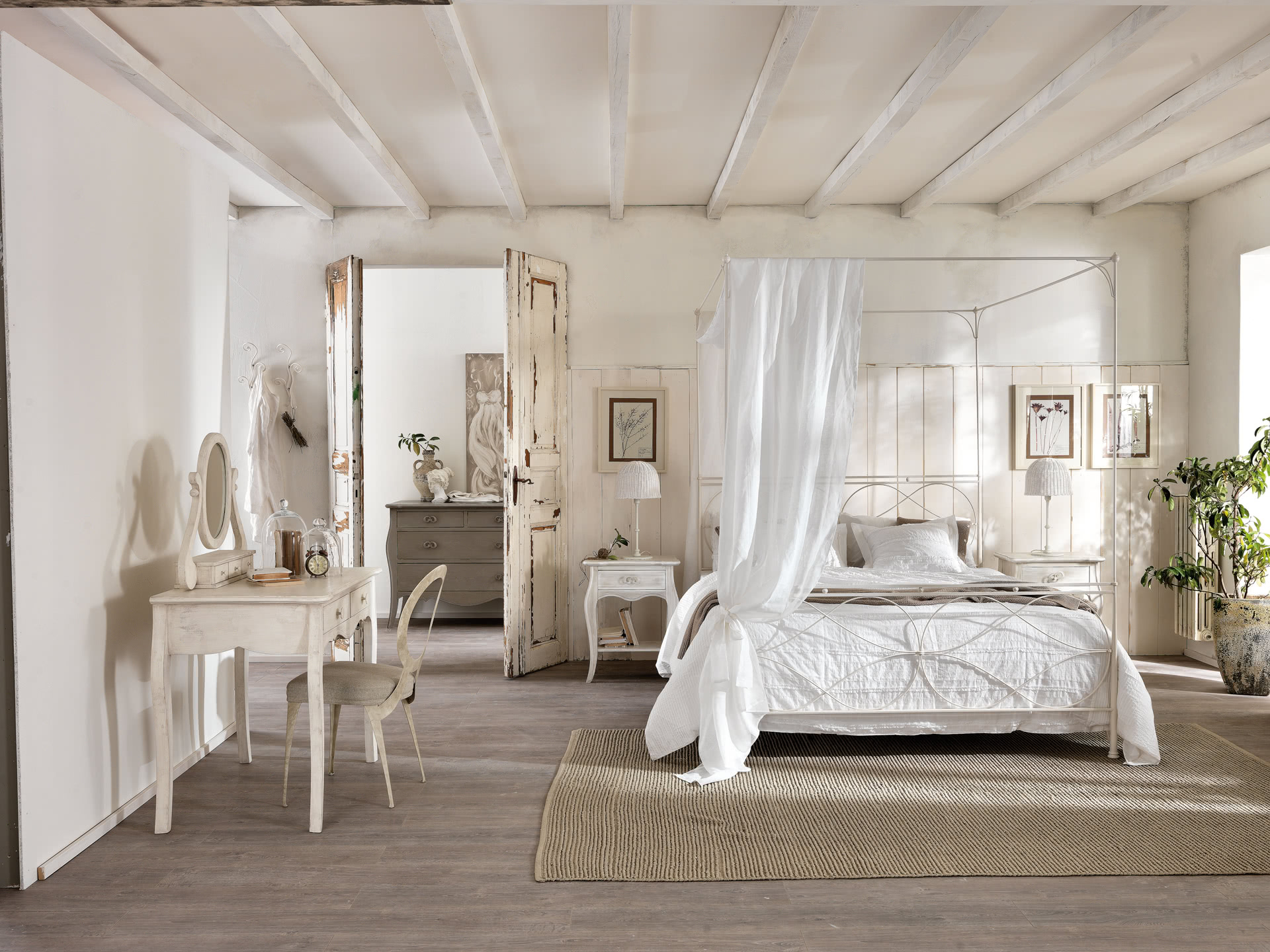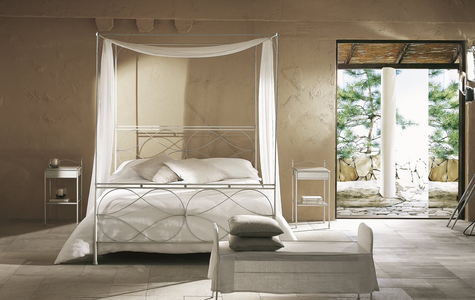 La struttura è realizzata in ferro battuto, tagliato a laser, interamente levigata e decorata a mano; l'imbullonatura è realizzata a caldo. Il letto Raphael, dal sapore country o vecchia marina, è perfetto per un loft o al centro della camera da letto; è disponibile in varie dimensioni, con o senza baldacchino, per reti da cm: 160x200 (letto matrimoniale), 180x200 (letto matrimoniale) e 200x200 (letto king size) anche nella versione con box contenitore. Su richiesta, il letto Raphael è disponibile anche fuori misura per materassi di lunghezza cm 210, 220, 230 o altre dimensioni richieste dal cliente; un letto più lungo per offrire il massimo comfort anche a persone molto alte.