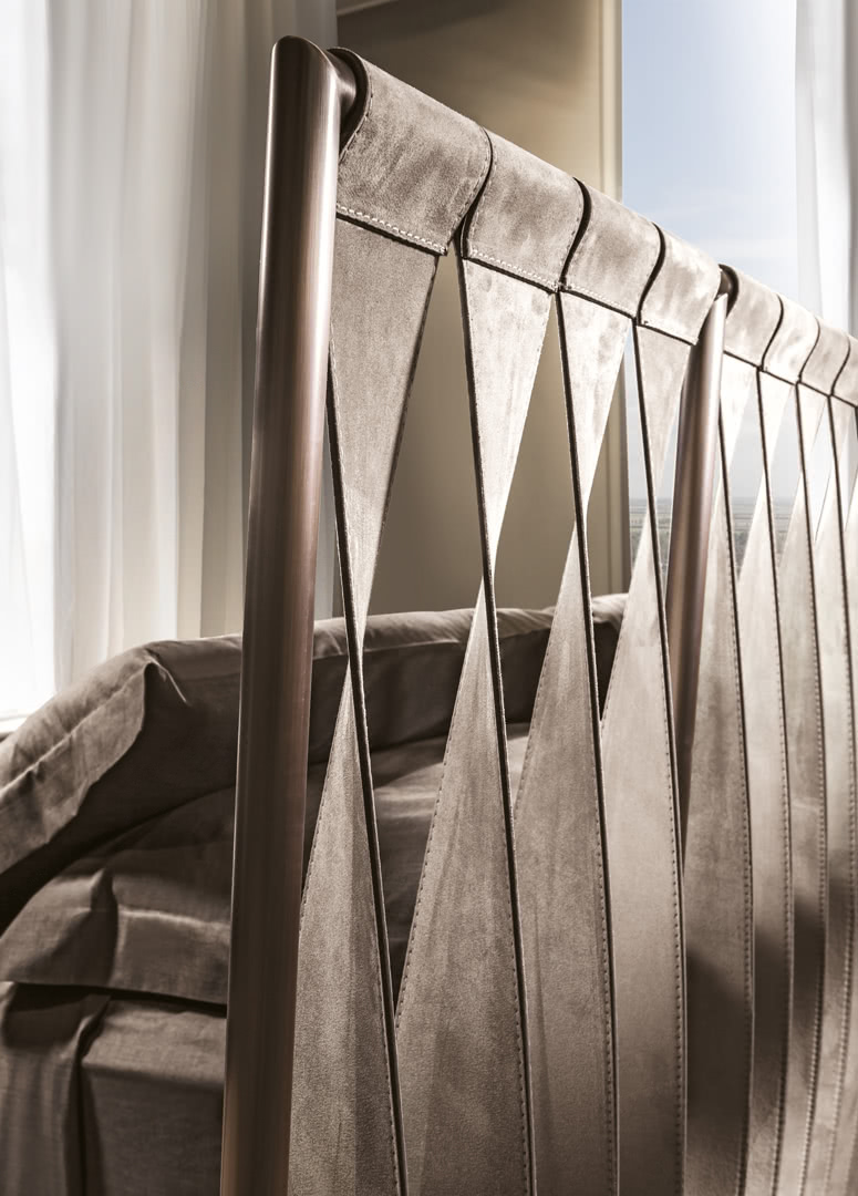 Letto matrimoniale moderno Twist con spalliera realizzato con fasce in pelle.