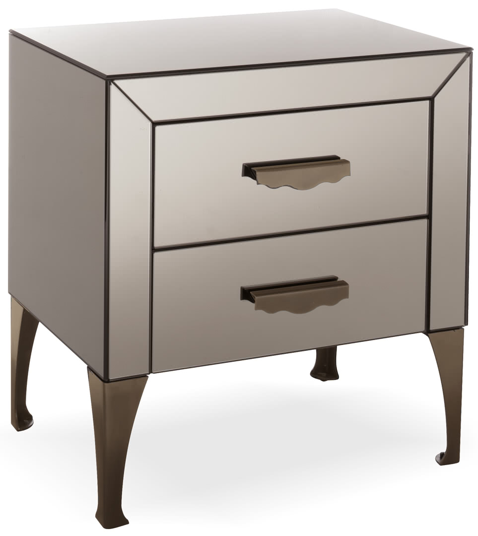 Presentano 2 cassetti con guide ad estrazione totale e richiamo frenato. Tutto rivestito in specchio molato con maniglie e piedi in metallo o in bronzo. Dei comodini dal sapore vintage che insieme al comò, creano un gruppo notte perfetto anche per una camera da letto classica o vintage.