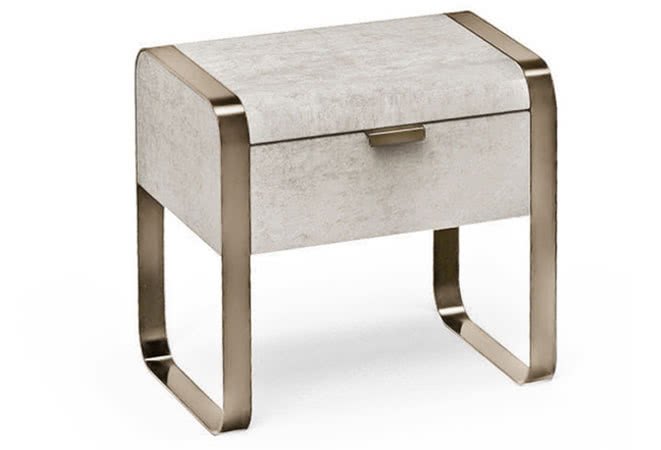 I cassetti, a richiamo frenato, e il top arrotondato sono realizzati in legno e completamente rivestiti in pelle o ecopelle. La struttura in metallo può essere finita in bronzo o in ferro patinato per rendere il comodino “vintage”. I comodini Elvis, insieme al comò, creano un gruppo notte moderno.
