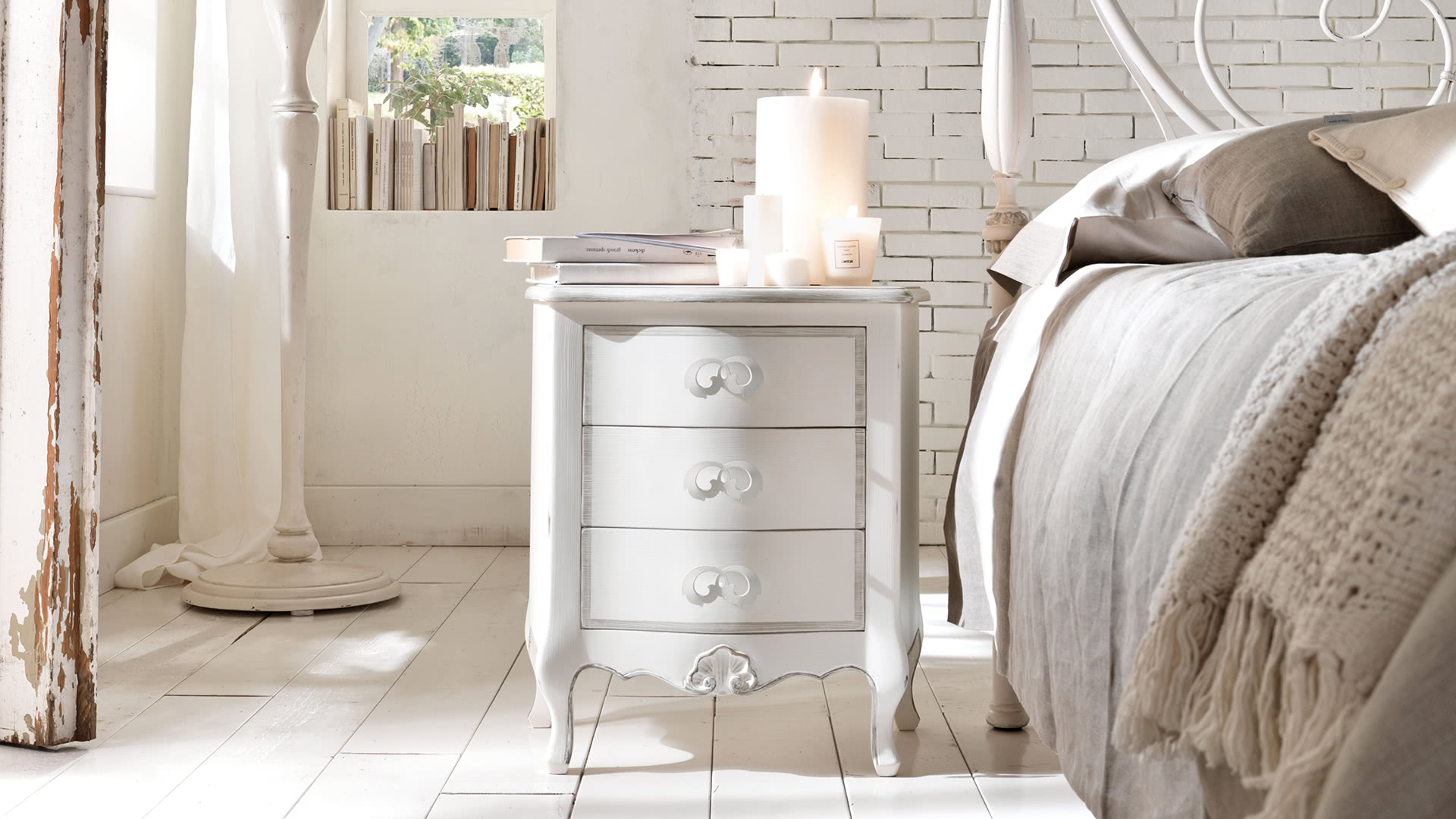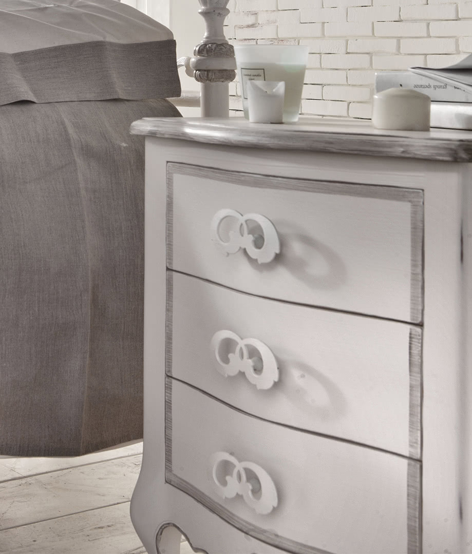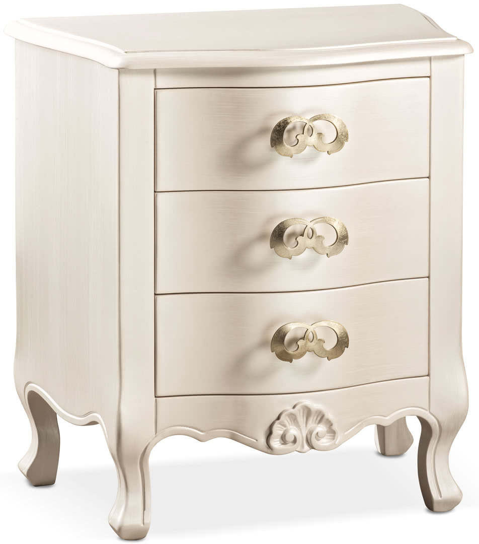 La struttura è realizzata in legno, sagomato e intarsiato, con finitura in foglia argento champagne decorata in madreperla a pennello o spatolata. Le maniglie sono realizzate in metallo. I comodini Enrico, insieme al comò, creano un gruppo notte perfetto per una camera da letto classica o vintage anni ‘50.