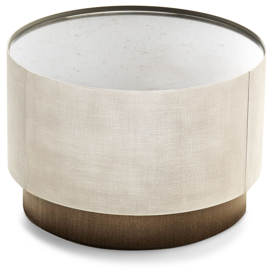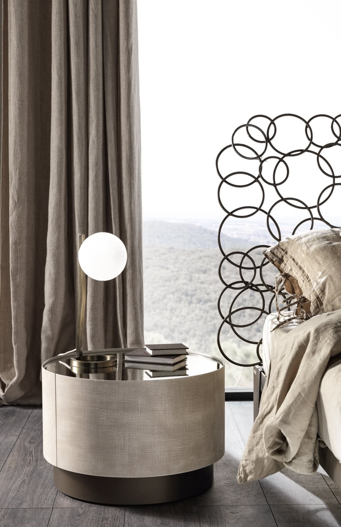 La base, con un cassetto a scomparsa, è decorata in bronzo mentre il top è realizzato in specchio fumé bronzo. Dei comodino dal design moderno e pulito che, insieme al comò, creano un gruppo notte elegante e unico.