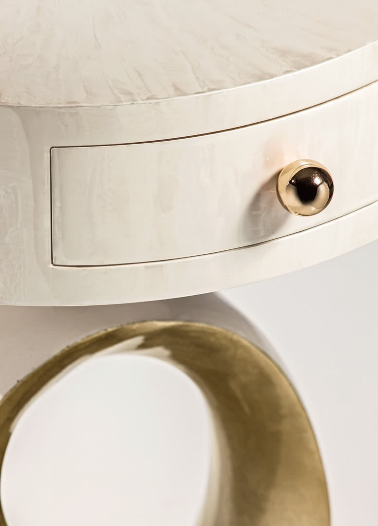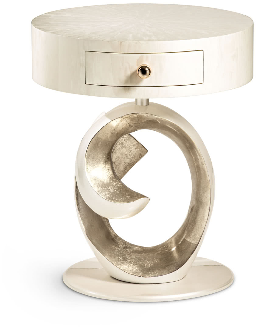 La base scultura in fusione è decorata a mano in foglia argento champagne o madreperla. Il top in legno è decorato a mano e presenta un cassetto rivestito in tessuto con pomo oro. I comodini Olga sono perfetti in camera da letto o come tavolino lato sofà in una sala dal design classico.