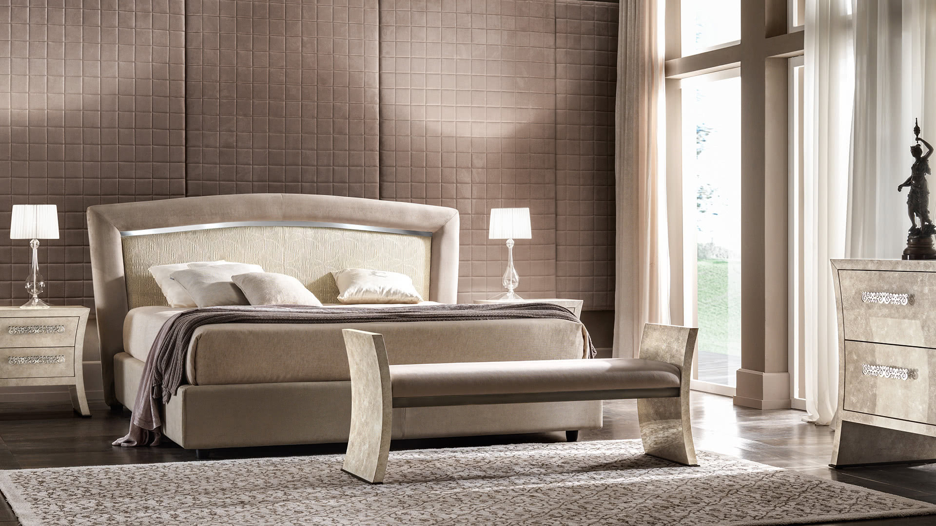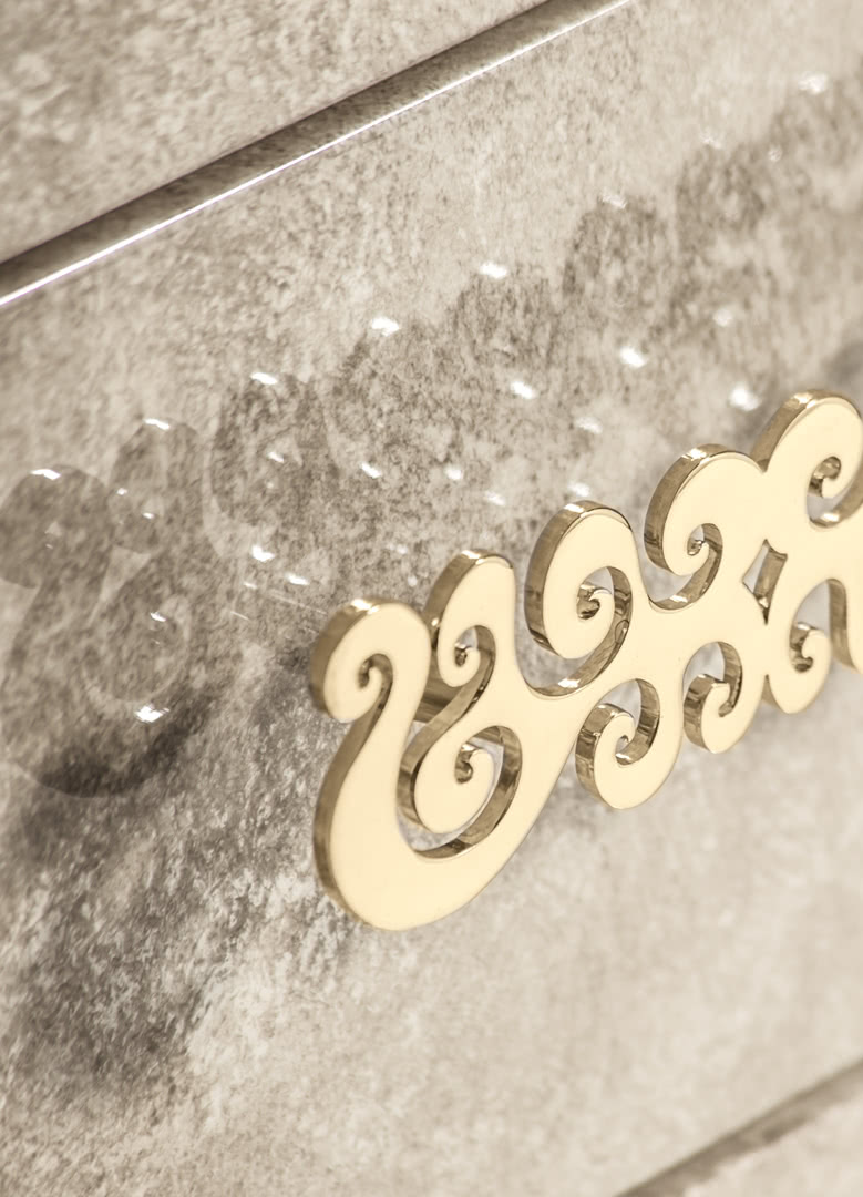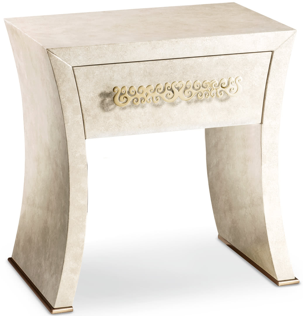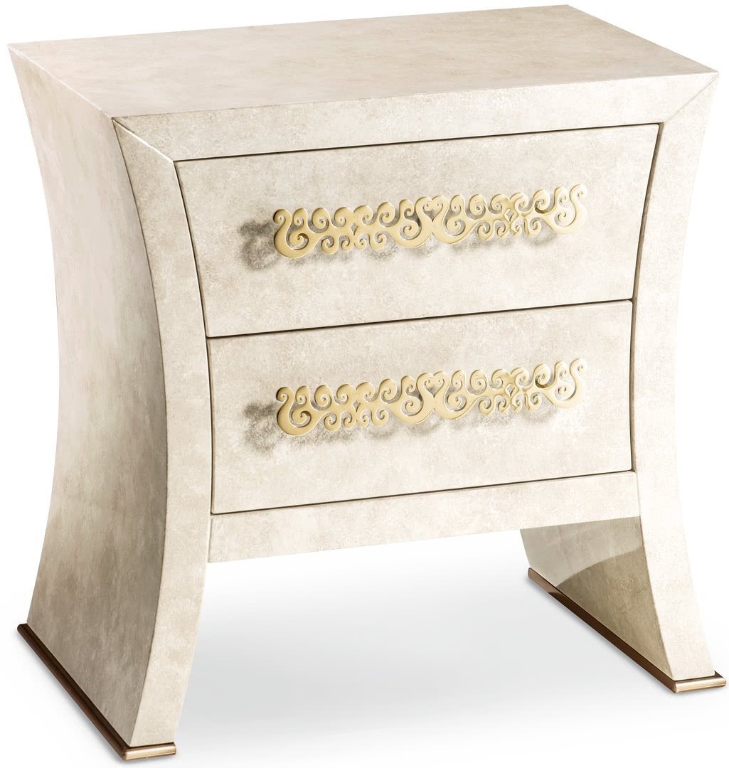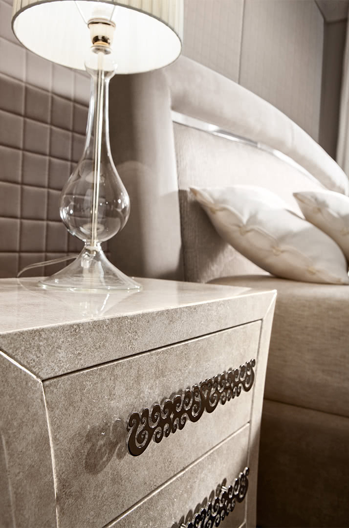La struttura, in legno curvato e sagomato, è realizzata in madreperla spatolato o nella nuova finitura seashell, che dona luminosità alla struttura dalle forme sinuose. I cassetti presentano delle maniglie tagliate a laser in oro pallido; la base è disponibile in bronzo. I comodini Richard, insieme al comò, creano un gruppo notte elegante e unico.