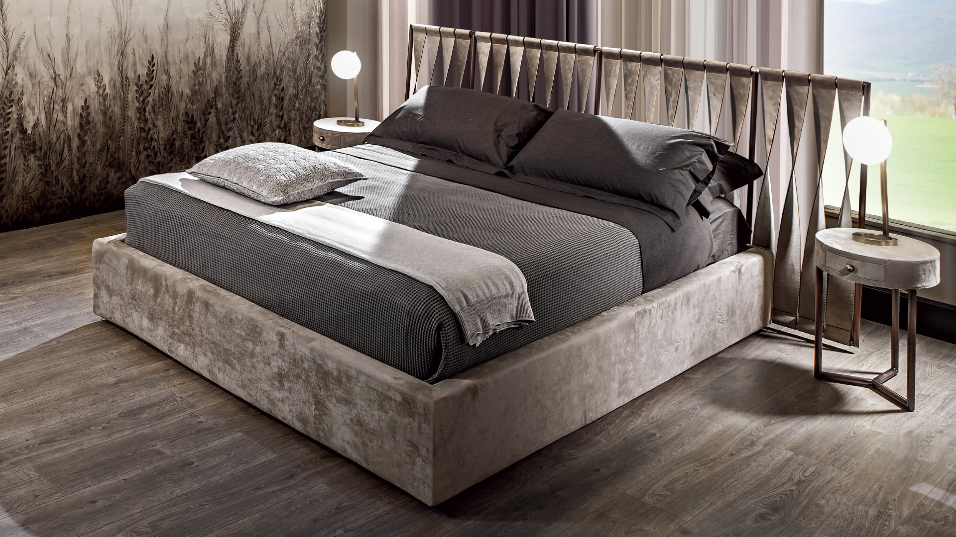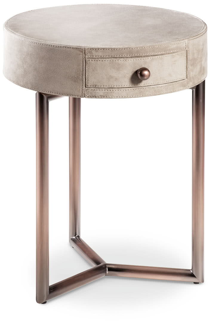 La struttura è finita a bagno di galvanica, in ottone o oro. Il top è disponibile rivestito in pelle, nabuk o ecopelle oppure laccato; il cassetto, con pomo oro, è rivestito internamente in tessuto. I comodini Teo sono perfetti per la camera da letto o per il salotto come tavolini lato sofà.