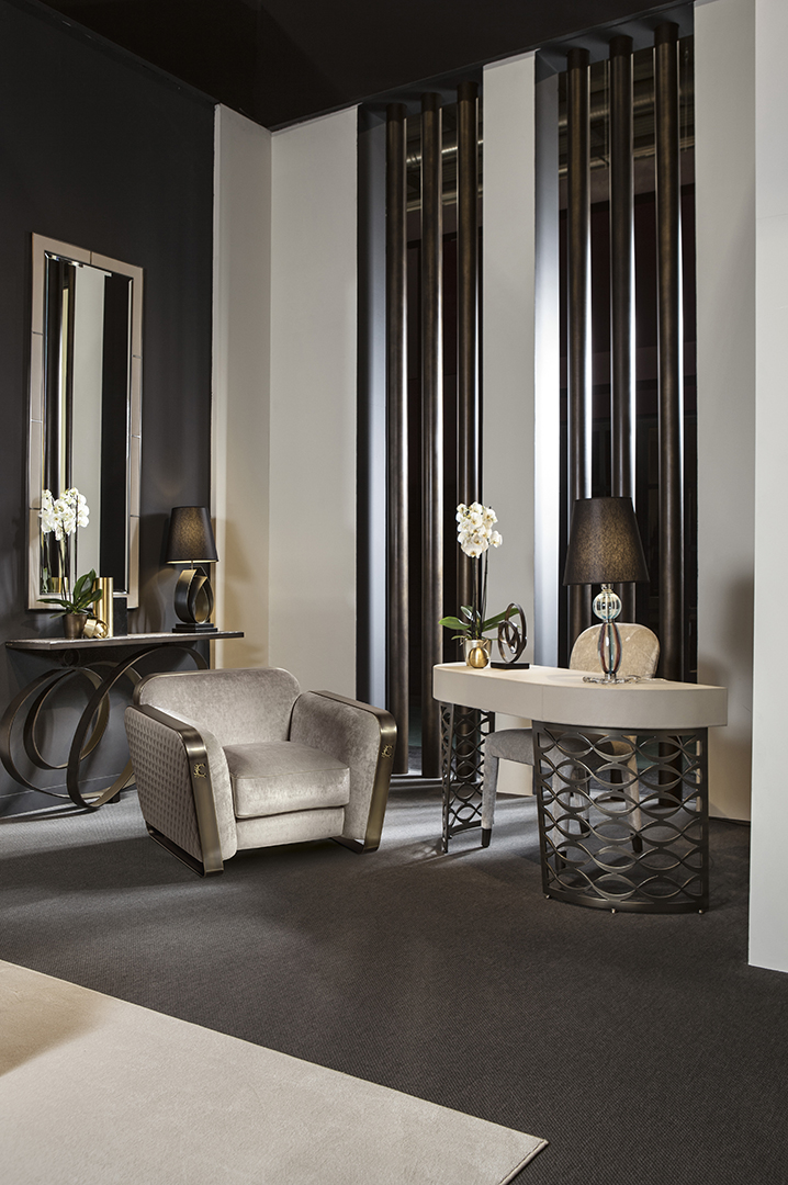 Un paralume in tessuto su una lampada, fatta da un foglio di acciaio curvato, in apparenza fluido ma solido e stabile al tatto. L’uso della finitura bronzo fa nascere luminosi e delicati riflessi che si accentuano con la luce accesa. Un design moderno che rende questa lampada/scultura adatta ad ogni ambiente e ad un gusto internazionale, classico o moderno.