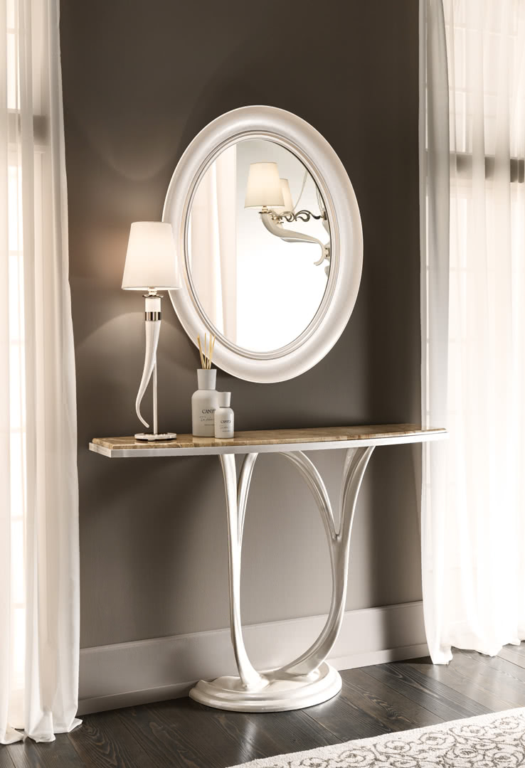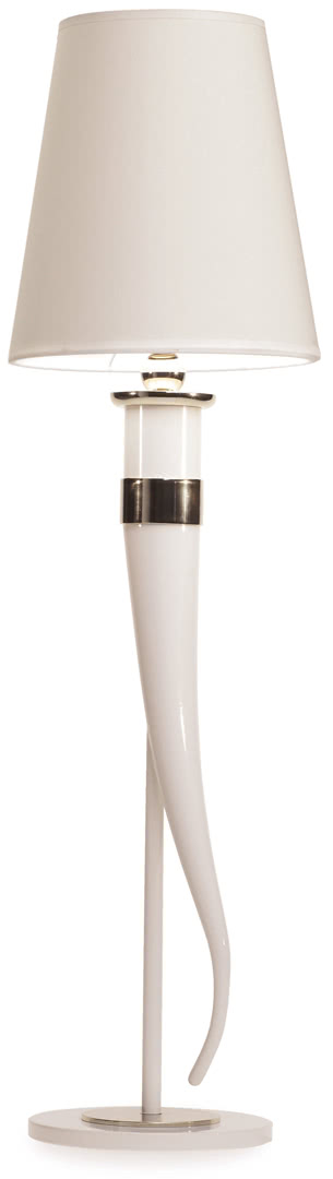 La struttura a forma di corno è in acciaio, conificato e curvato, con decorazioni tagliate a laser e dettagli finiti oro; il paralume a cono è realizzato in lino accoppiato e autoestinguente. Una lampada da comodino ideale per una camera da letto, una sala o un ingresso dal sapore internazionale e sofisticato.