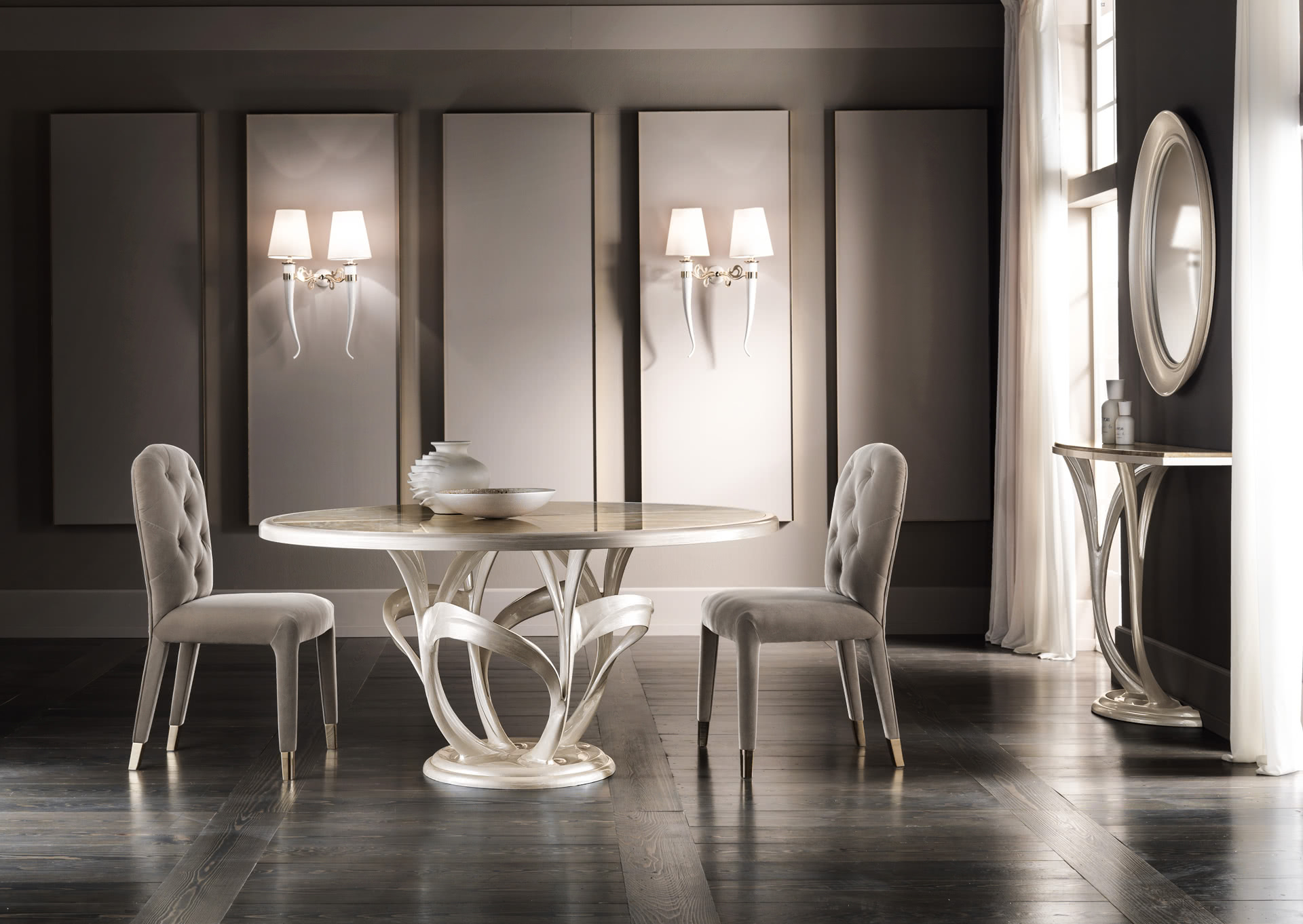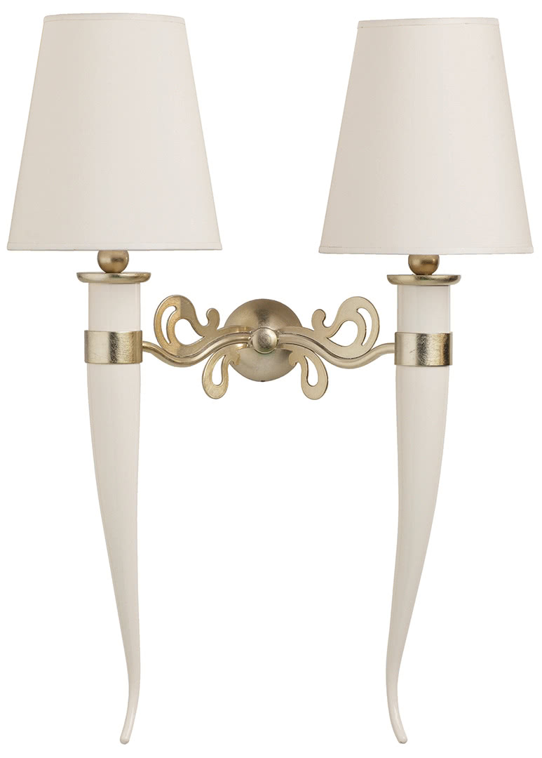 La struttura a forma di corno è in acciaio, conificato e curvato, con decorazioni tagliate a laser e dettagli finiti oro; i paralumi a cono sono realizzati in lino accoppiato e autoestinguente. Una lampada da parete ideale per una camera da letto, una sala o un ingresso dal sapore internazionale e sofisticato.