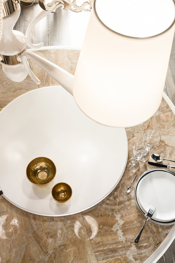 La struttura del corpo centrale è in tornito di legno con quattro bracci in acciaio, impreziosita da fili di perle che scivolano tra i decori; i paralumi a cono sono realizzati in lino accoppiato e autoestinguente. Un lampadario perfetto per una camera da letto, una sala o un ingresso dal sapore internazionale e sofisticato.