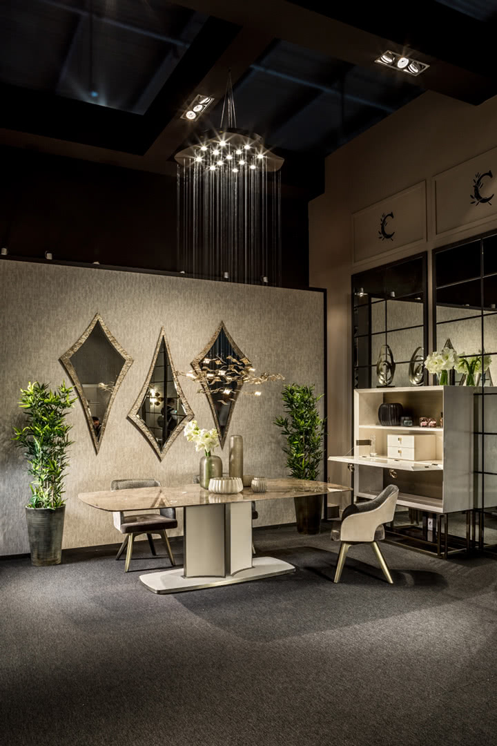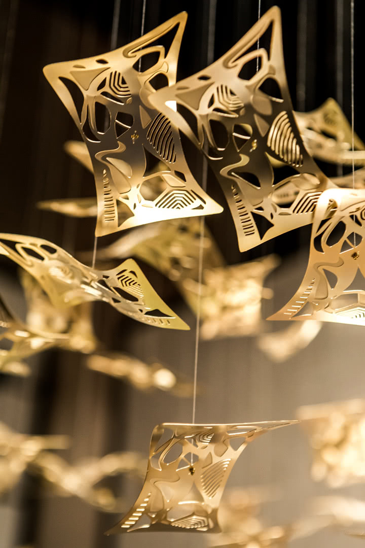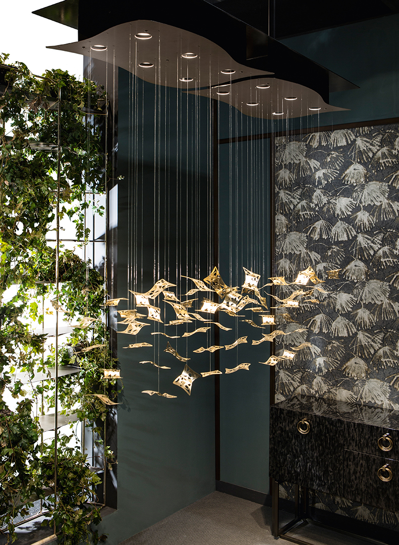 La plafoniera è costituita da una struttura metallica con una parte cilindrica, nera opaca, e una sagomata, in ottone; gli elementi sospesi sono realizzati con la tecnologia della fotoincisione chimica e tenuti da cavetti trasparenti, di altezza personalizzabile. Ogni elemento sospeso è indipendente dal suo vicino, tuttavia il movimento del singolo trasmette il moto agli elementi vicini creando quindi un “comportamento” uniforme. Il design di questi elementi gioca sul dettaglio delle superfici disegnate per ottenere trasparenze e giochi di riflessi. Un design moderno e sofisticato per un lampadario a sospensione perfetto per la sala.
