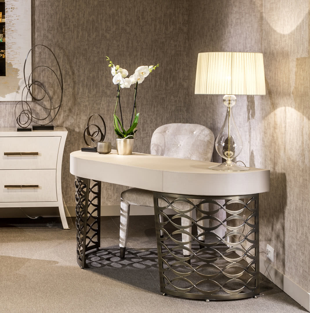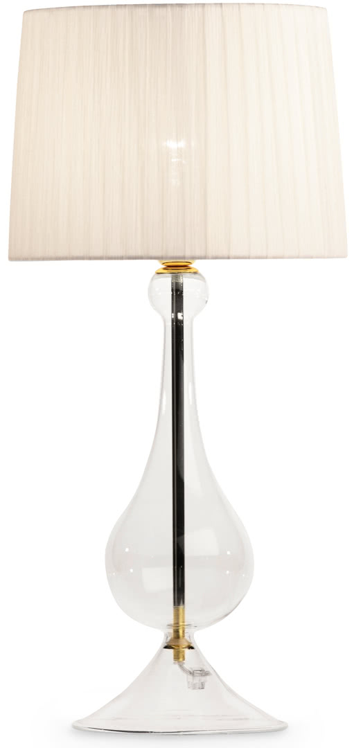 La base in vetro boro silicato, soffiato a lume, decorato e bombato a mano (resistente al calore e inattaccabile da acidi) è caratterizzato da una particolare brillantezza; la struttura in vetro può subire una naturale variazione di dimensione. La montatura è realizzata in ottone, mentre il paralume, a tronco di cono, è in tessuto plissettato. Una lampada da tavolo perfetta per una camera da letto, una sala o un ingresso dal sapore internazionale e sofisticato.