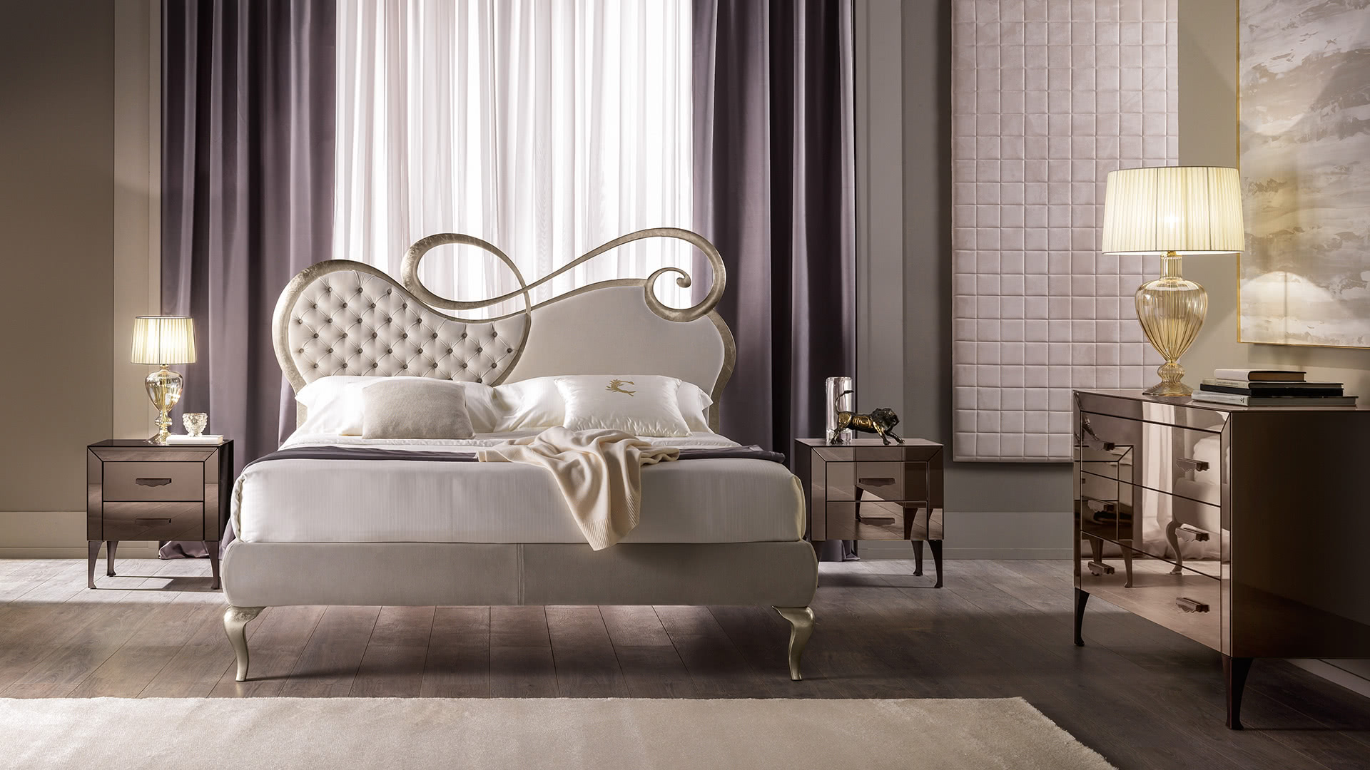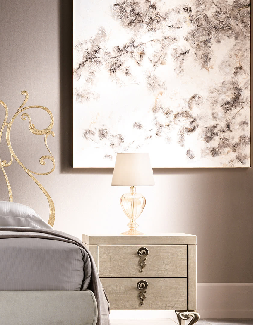 La base in vetro boro silicato, soffiato a lume, decorato e bombato a mano (resistente al calore e inattaccabile da acidi) è caratterizzato da una particolare brillantezza; la struttura in vetro può subire una naturale variazione di dimensione. La montatura è realizzata in ottone, mentre il paralume, a tronco di cono, è in tessuto plissettato. Una lampada da comodino perfetta per una camera da letto, una sala o un ingresso dal sapore internazionale e sofisticato.