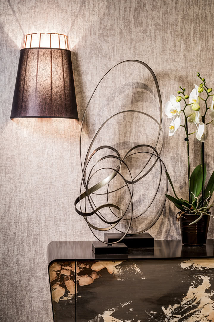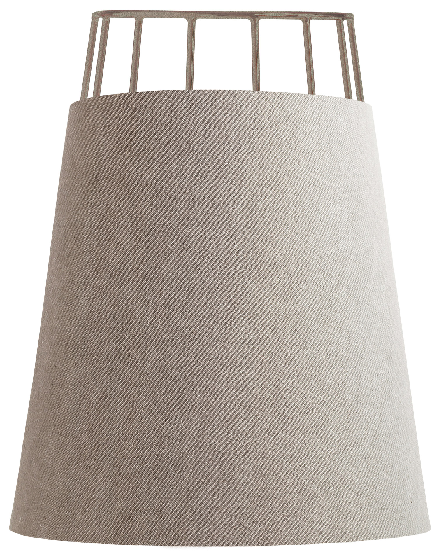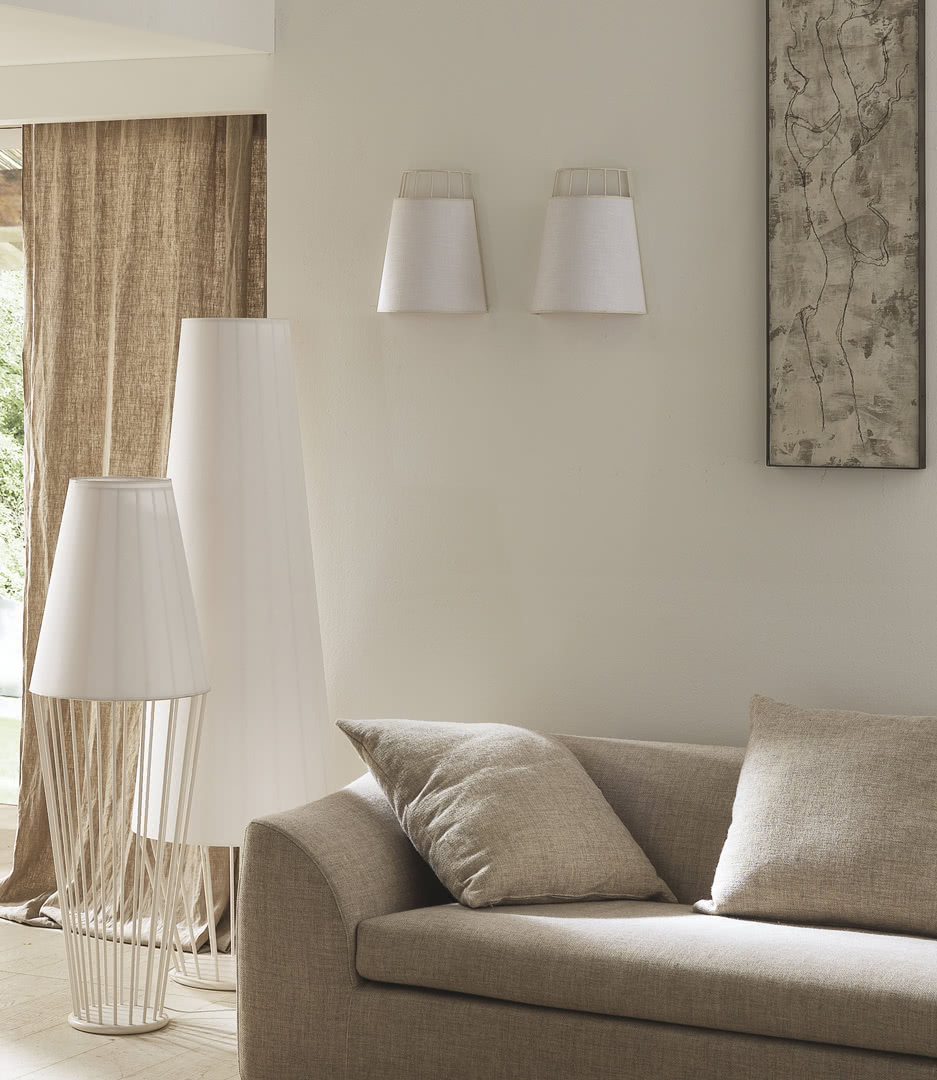 La struttura a gabbia è realizzata in tondino di acciaio e fusione di ottone, con saldature a filo e ottone, e finitura in galvanica oro, rame, nichel nero o ferro metallizzato. Il paralume a tronco di cono è in cotone o lino accoppiato. Una lampada da parete dal design moderno ma adatta ad ogni stile, perfetta per la camera da letto, il corridoio, la sala o vicino ad una consolle nell'ingresso.