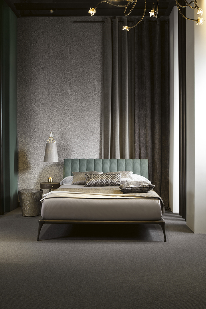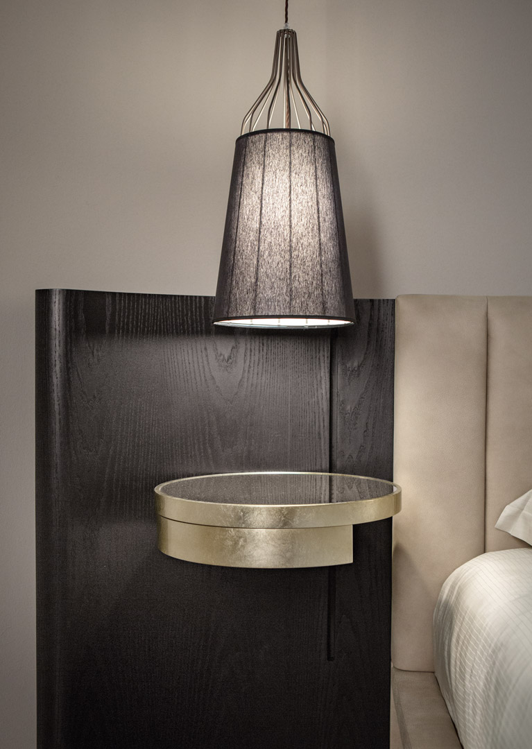 La struttura a gabbia è realizzata in tondino di acciaio e fusione di ottone, con saldature a filo e ottone, e finitura in galvanica oro, rame, nichel nero o ferro metallizzato. Il paralume a tronco di cono è in cotone o lino accoppiato. Un lampadario dal design moderno ma adatto ad ogni stile, perfetto sopra il comodino in camera da letto o sopra il tavolo in soggiorno.