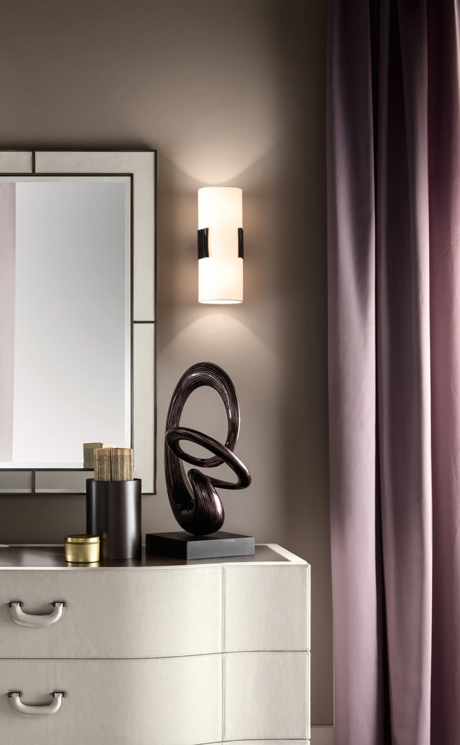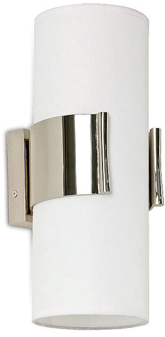 La fascia di attacco al paralume in ferro, curvato e sagomato, è finita in bronzo, oro, rame, ottone spazzolato o nichel; il paralume fisso a cilindro è realizzato in lino accoppiato. Una lampada da parete dal design sobrio e lineare, adatta ad un ingresso, una camera da letto o a un bar dal gusto raffinato.
