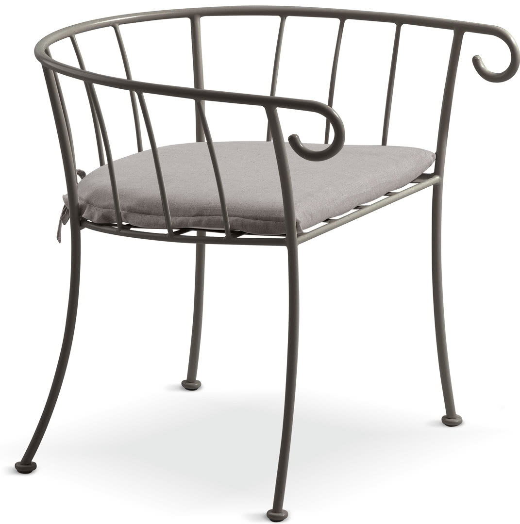 La struttura è in ferro antracite, curvato, rastremato e battuto a caldo, con saldature a filo e levigatura realizzate a mano. Il cuscino per la seduta è completamente sfoderabile.