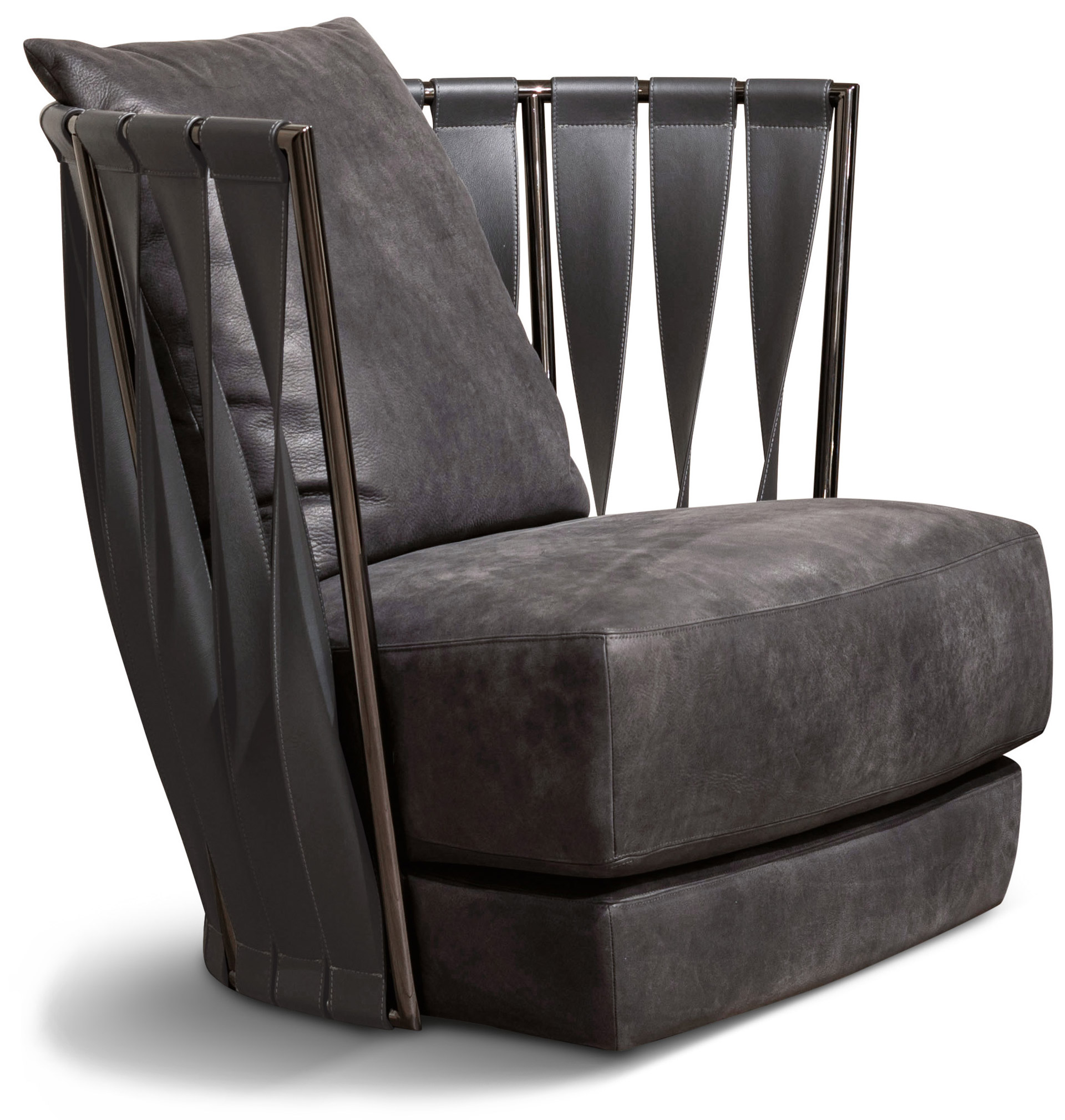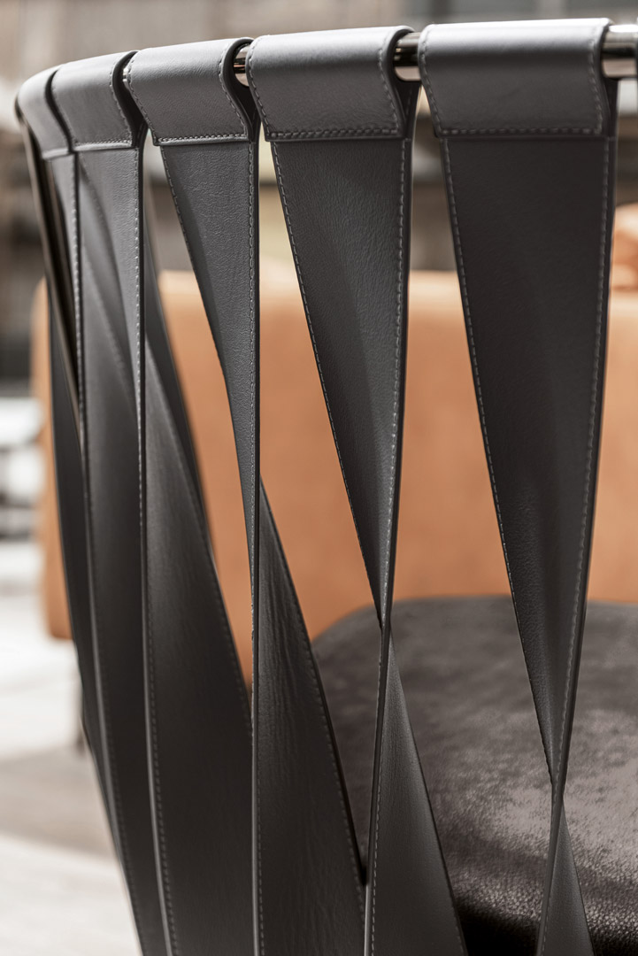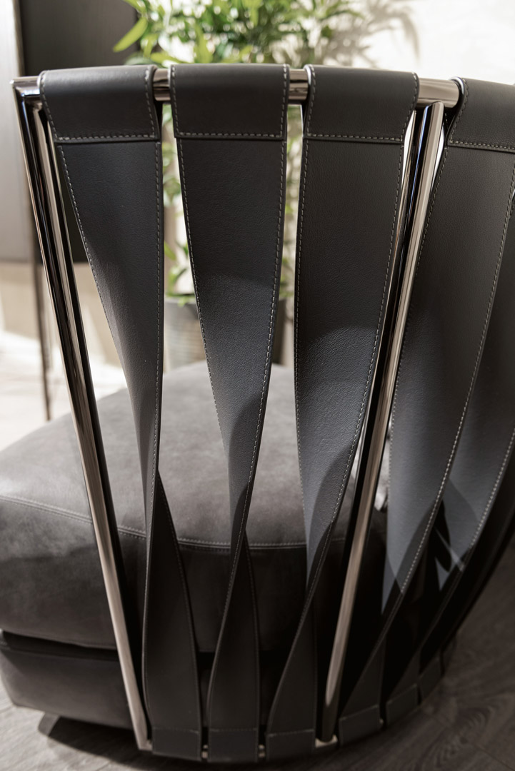 Poltrona moderna di design Twist con schienale a fasce in pelle o ecopelle.