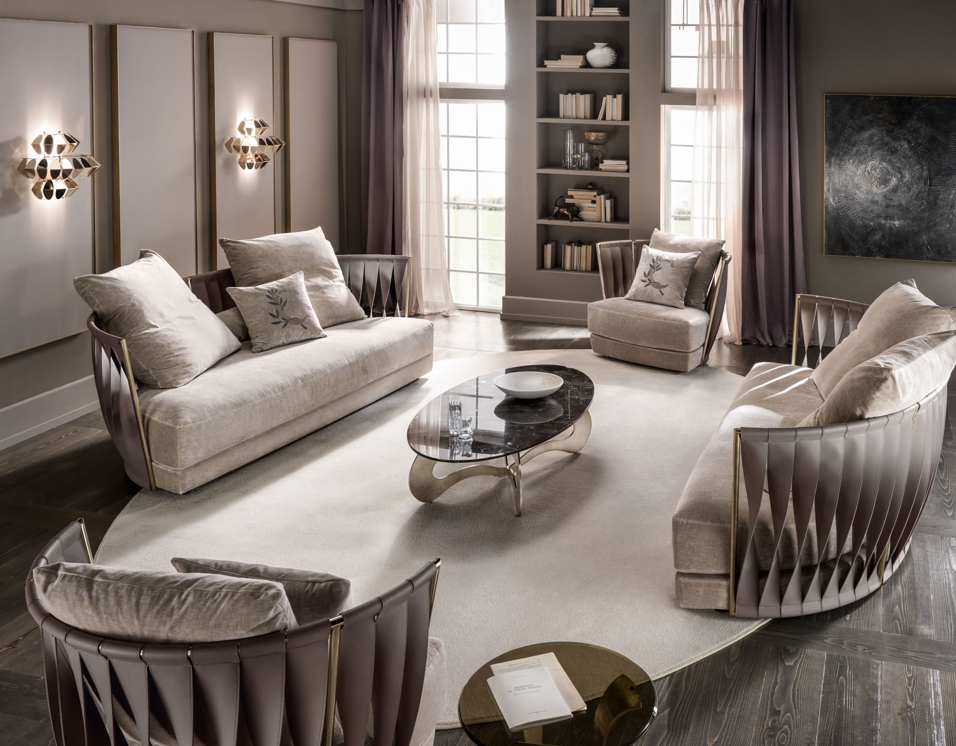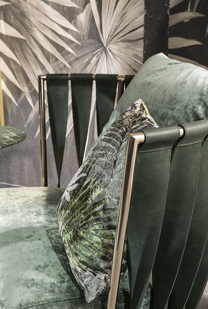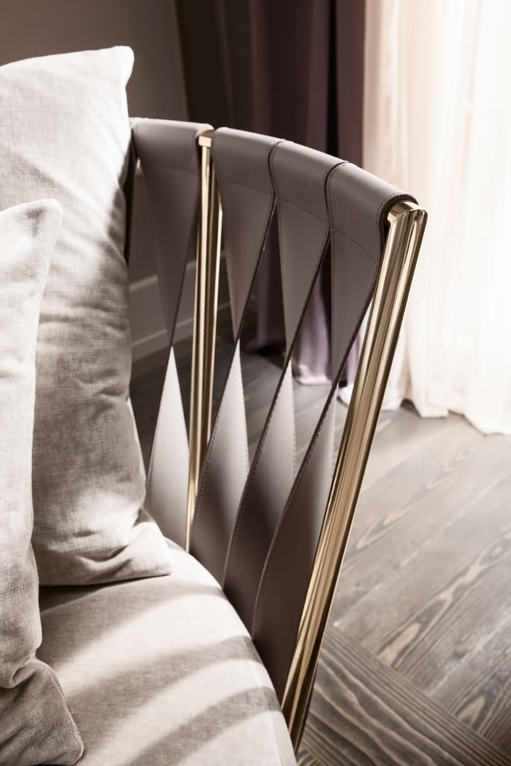 La struttura, in ferro curvato, sagomato e saldato a filo, è disponibile in finitura a bagno di galvanica in oro, ottone, nichel nero o rame. La spalliera è costituita da fasce ritorte cucite a mano e con la caratteristica impuntura a vista, realizzabili in pelle, ecopelle, nabuk o econabuk. La seduta, in legno multistrato di pioppo pantografato, è imbottito in gomma, con strato superiore in piume, ed rivestito sartorialmente in tessuto, velluto, pelle o con un tessuto fornito dal cliente. I cuscini decorativi sono imbottiti con piume.