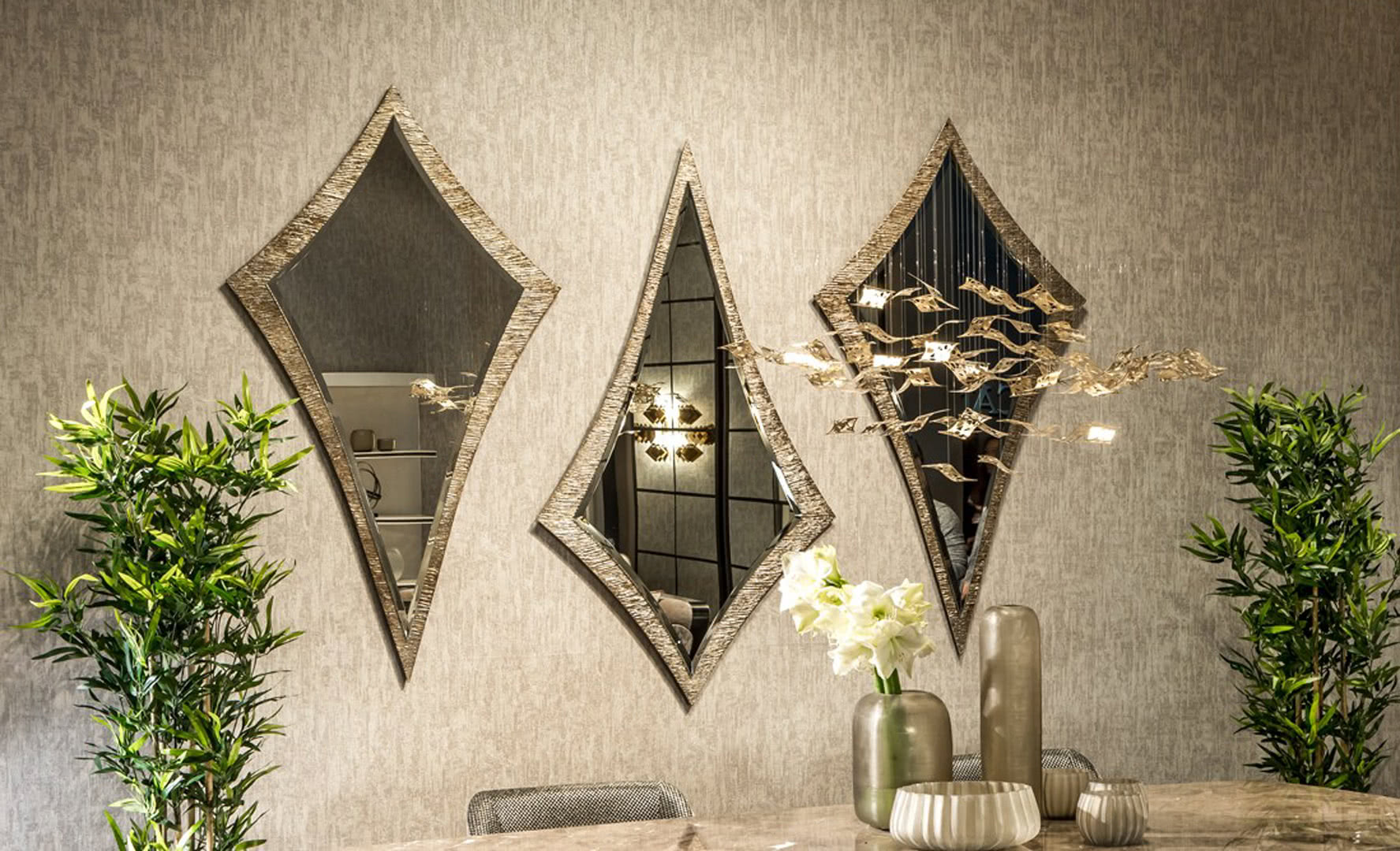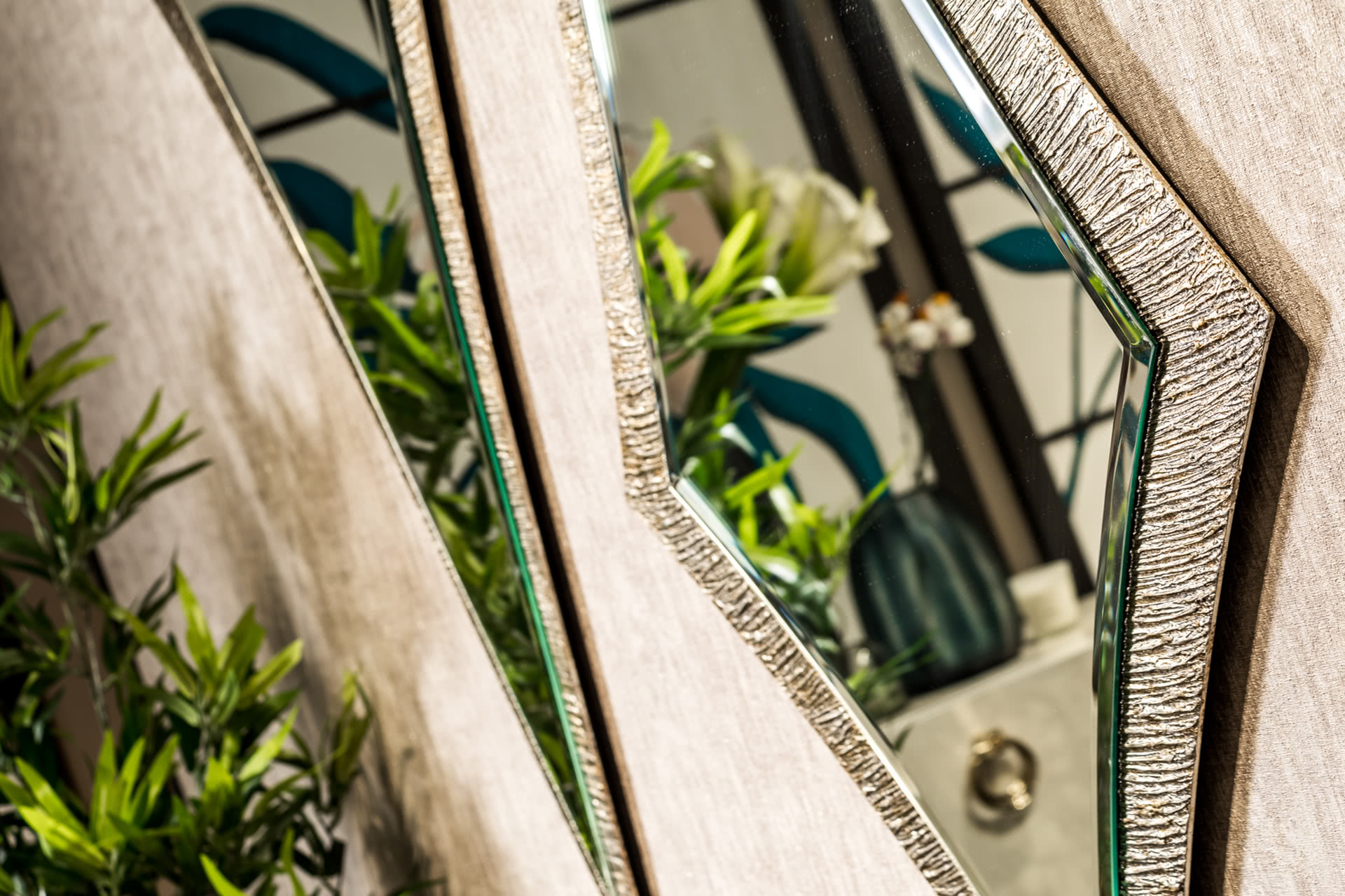 Lo specchio è in vetro molato di forma irregolare mentre la cornice è realizzata in ferro piatto tagliato a laser con decorazione artigianale in stucco e foglia argento. La forma di questa specchiera permette di creare diverse composizioni sulla parete della sala o dell'ingresso.