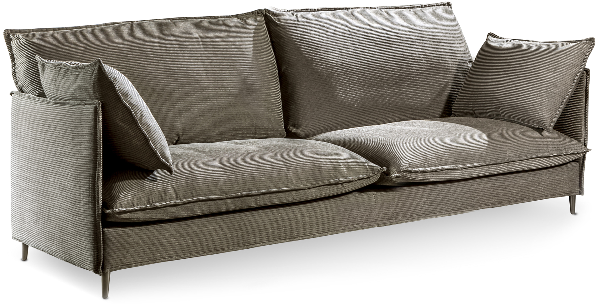 La struttura, in legno multistrato, è sottile e con proporzioni studiate per ottenere una profondità? contenuta ma accogliente grazie anche ai cuscini di seduta e di appoggio che offrono il massimo comfort. Il molleggio è garantito da cinghie elastiche ricoperte in poliuretano espanso ad alta densità. L'imbottitura del sedile è in poliuretano elastico sagomato mentre lo schienale ed i braccioli del sofà sono in legno multistrato imbottito e rivestito. I piedini a tronco di cono sono disponibili in varie finiture e aggiungono eleganza e personalità al disegno sottile. I cuscini sfoderabili della seduta e dello schienale, in morbida piuma d’oca canalizzata, con inserto in poliuretano espanso a quote differenziate, sono disponibili in pelle o tessuto anche fornito dal cliente. Un divano che invita al relax nella quotidianità della zona living.
