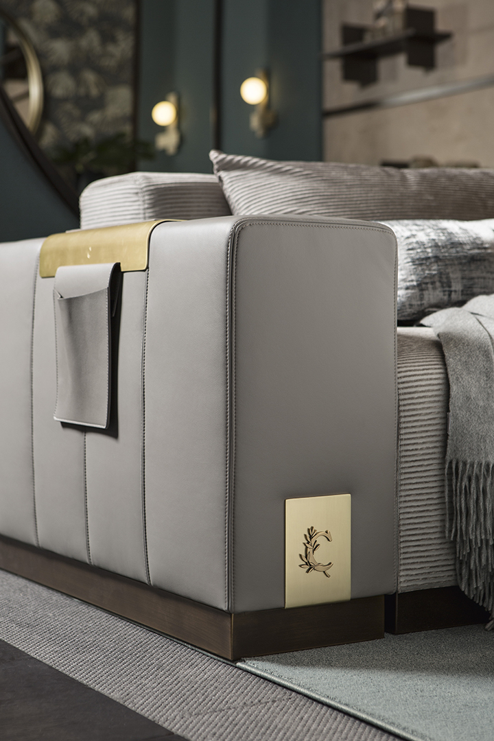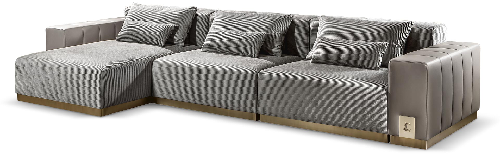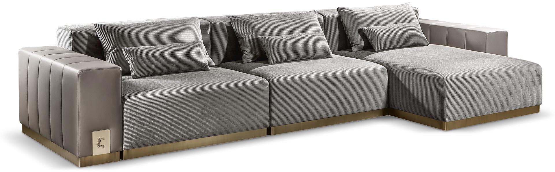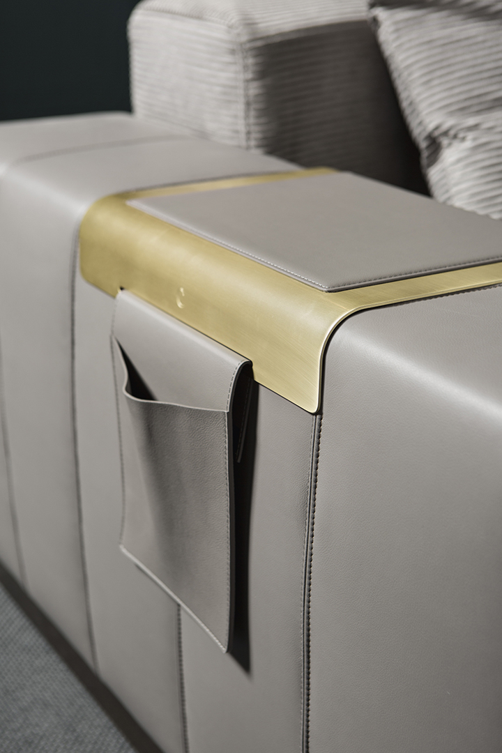 La struttura è in legno multistrato e il molleggio è garantito da cinghie elastiche ad alta componente di caucciù. Il rivestimento strutturale è in poliuretano espanso a quote differenziate ad alta densità e lo strato superiore ad alta componente elastica che, aggregato allo strato inferiore, garantisce una migliore morbidezza nel tempo. La base e il dettaglio in metallo del bracciolo lo incorniciano e ne esaltano il design lineare. Il rivestimento dei braccioli può essere a contrasto o in pelle o personalizzabile con tessuto fornito dal cliente. Un divano caratterizzato da una rigorosa aggregazione di volumi, con braccioli e schienali disegnati da cuciture che ne accentuano il carattere grafico e moderno. Personalizzazione, comfort, praticità: il divano modulare può essere composto e scomposto nelle forme per rendere chi lo acquista progettista del proprio living, grazie alla possibilità di creare la soluzione più adatta al proprio soggiorno e di modificare la disposizione in base alle esigenze, riorganizzando o aggiungendo nuovi elementi creando un divano lineare o angolare. Un sofà con la particolarità di poter utilizzare braccioli e schienale come comode sedute.