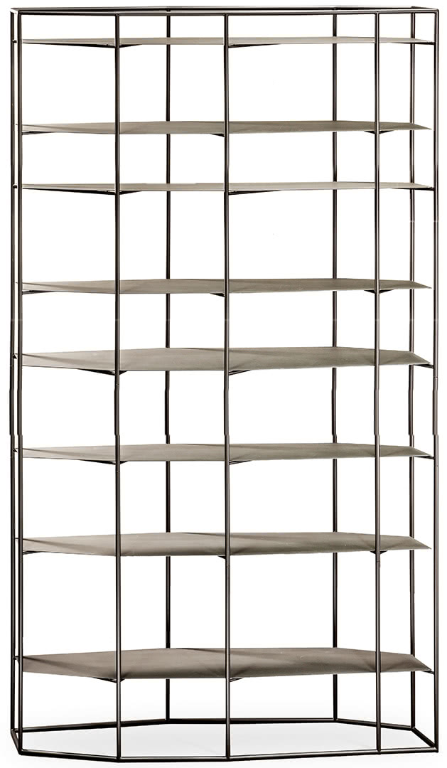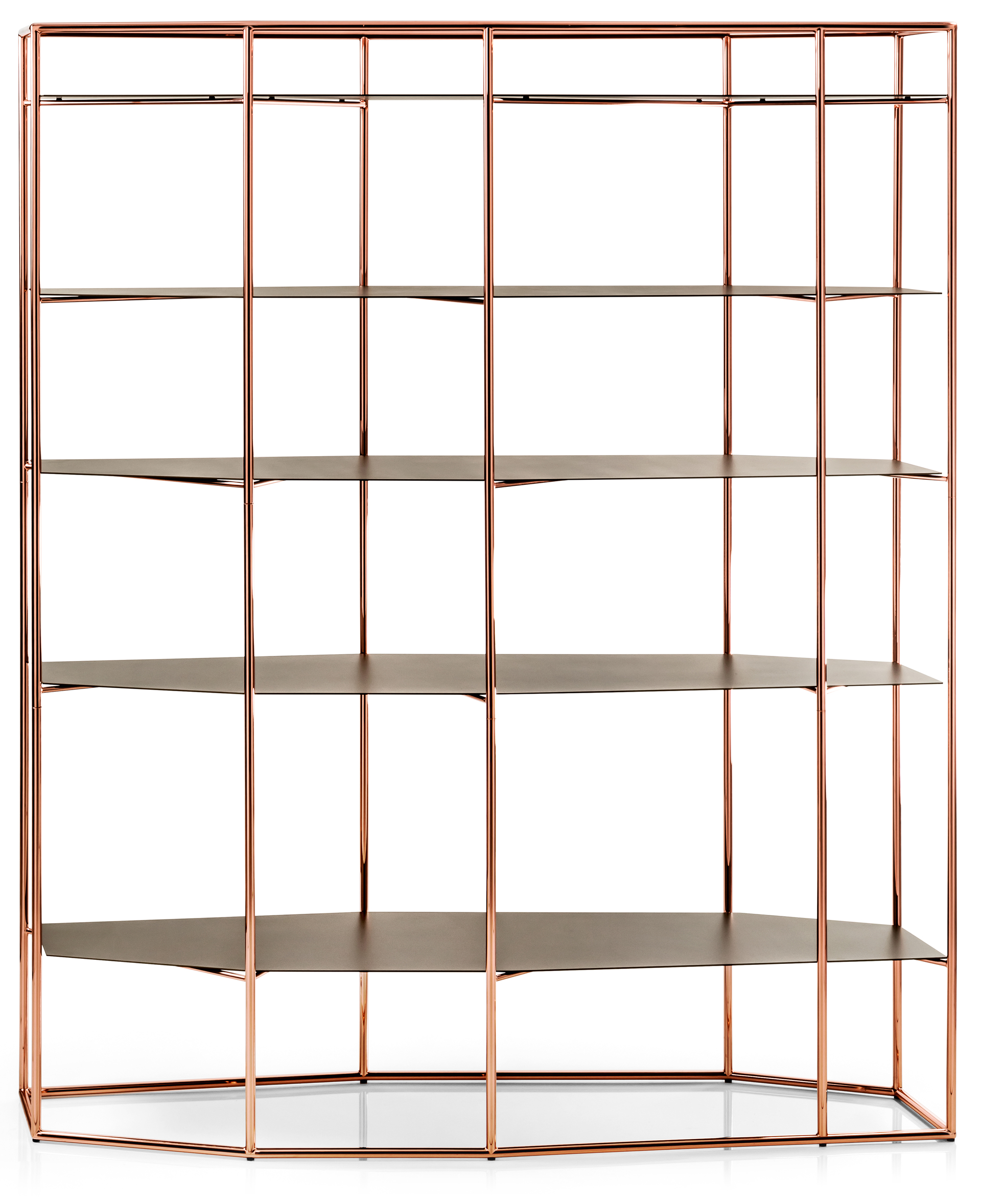 La struttura portante, montata ad incasso, in tondino di metallo è disponibile in oro, rame, ottone o nero seppia. Le mensole sagomate sono realizzate in ferro metallizzato. La libreria Diadema è disponibile in diverse altezze per riempire tutta la parete fino al soffitto perfetta anche come centro stanza per dividere un moderno openspace.