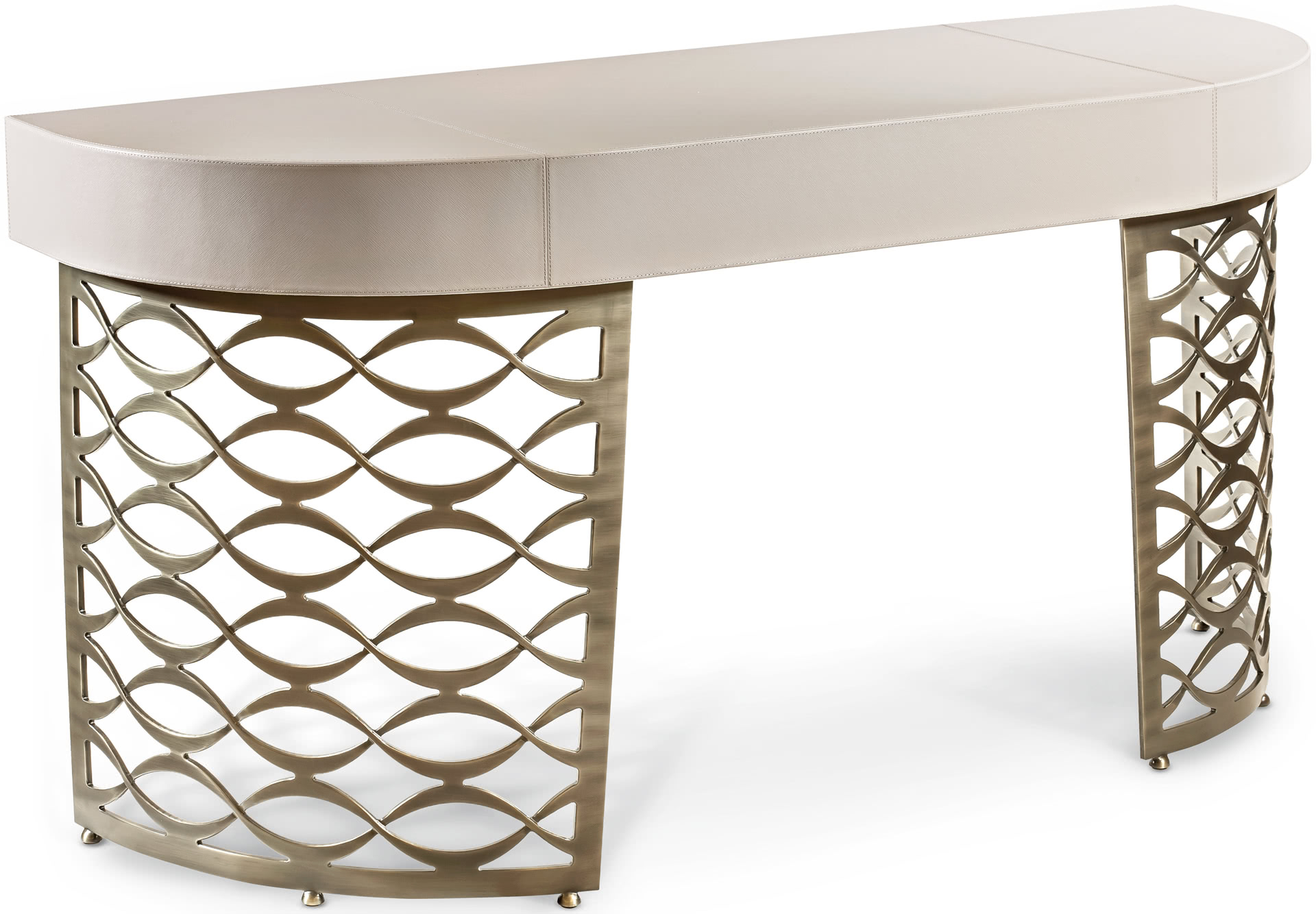 La base in ferro pieno è tagliato a laser, fresato e curvato a formare un disegno tridimensionale dal forte impatto visivo; disponibile nelle finiture dorate e bronzate o in foglia. Il piano in legno è sagomato e rivestito in pelle, contiene un cassetto estraibile a scomparsa. La scrivania Isidoro è disponibile in due diverse misure; ideale per la camera o un ufficio privato grazie al gusto internazionale.
