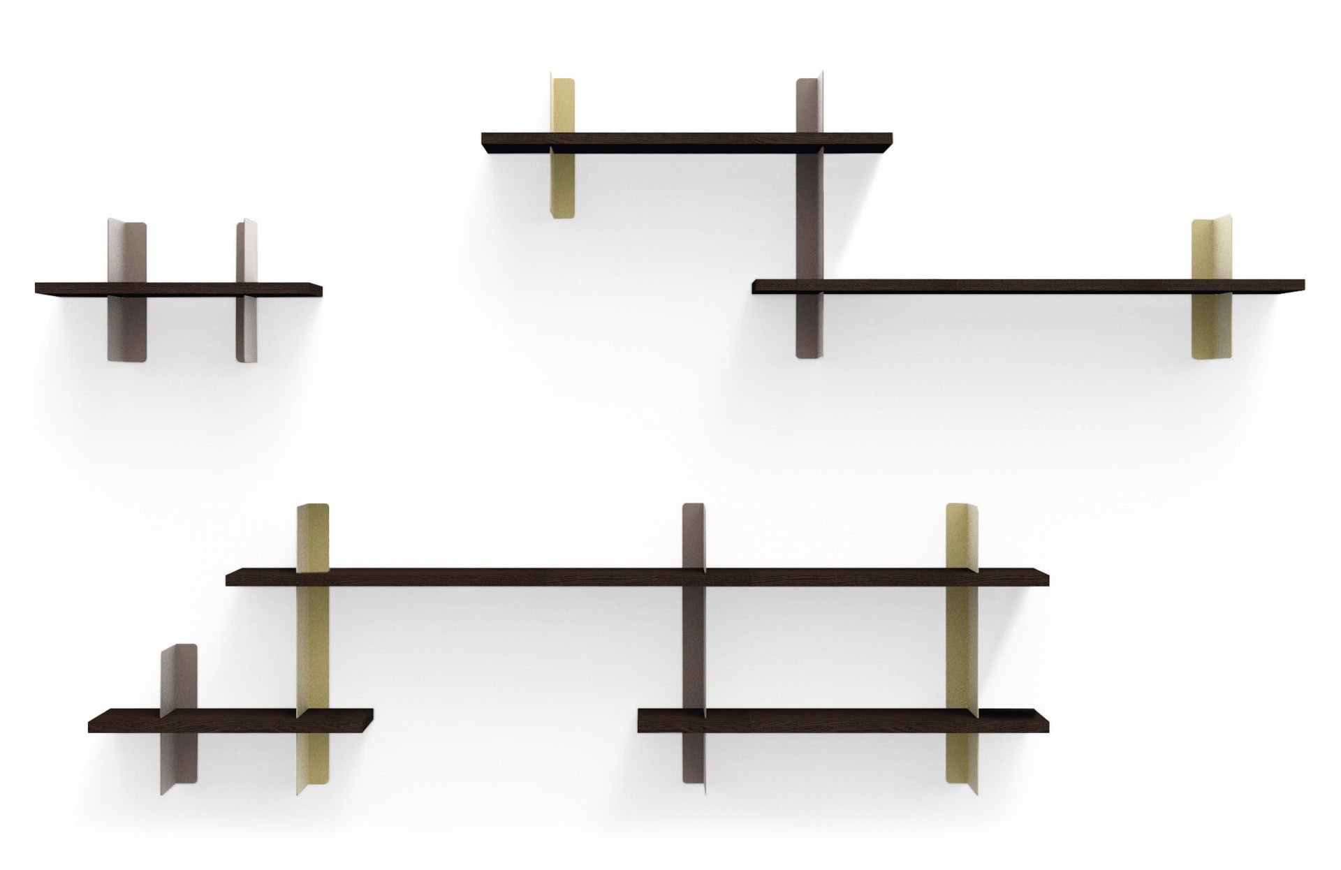 Sistema di libreria componibile, da appendere a parete, formata da mensole in legno massello, disponibili in quattro diverse lunghezze, e supporti con uno o due vani per ripiani, realizzabili in ottone spazzolato o ferro patinato. Finiture ricercate e materiali forti per una libreria che diventa un disegno grafico decorativo.