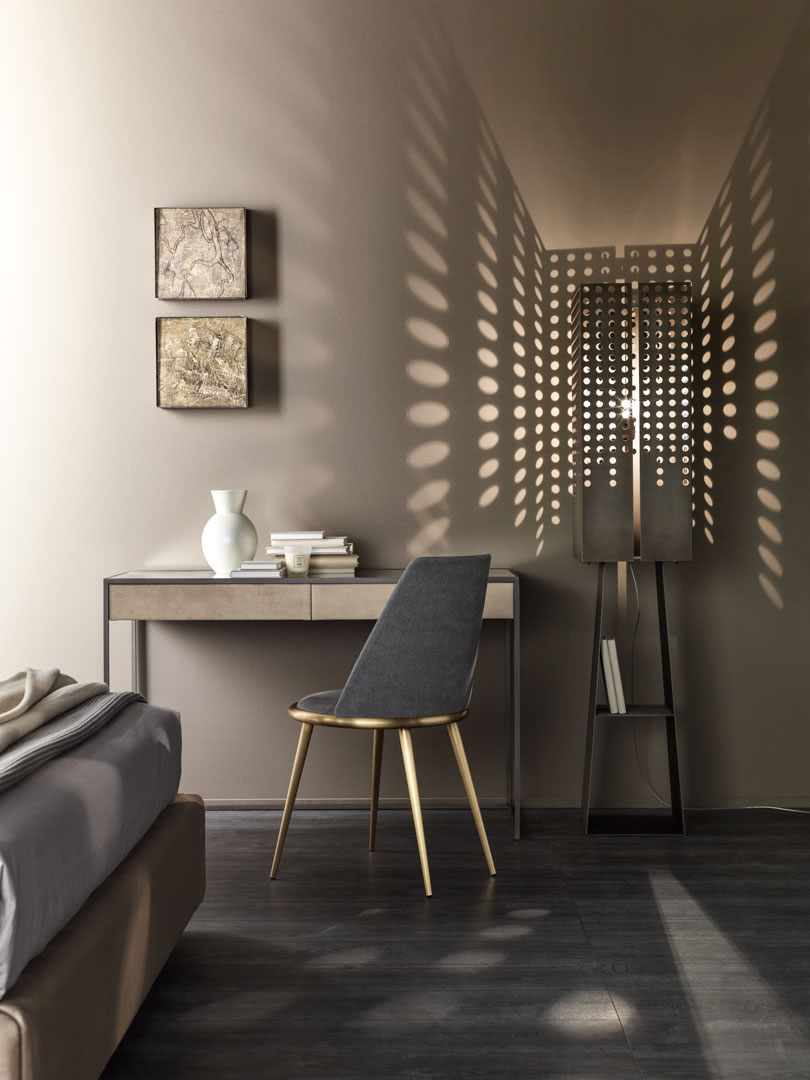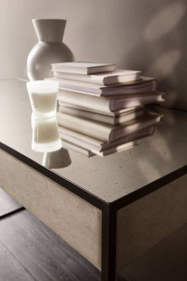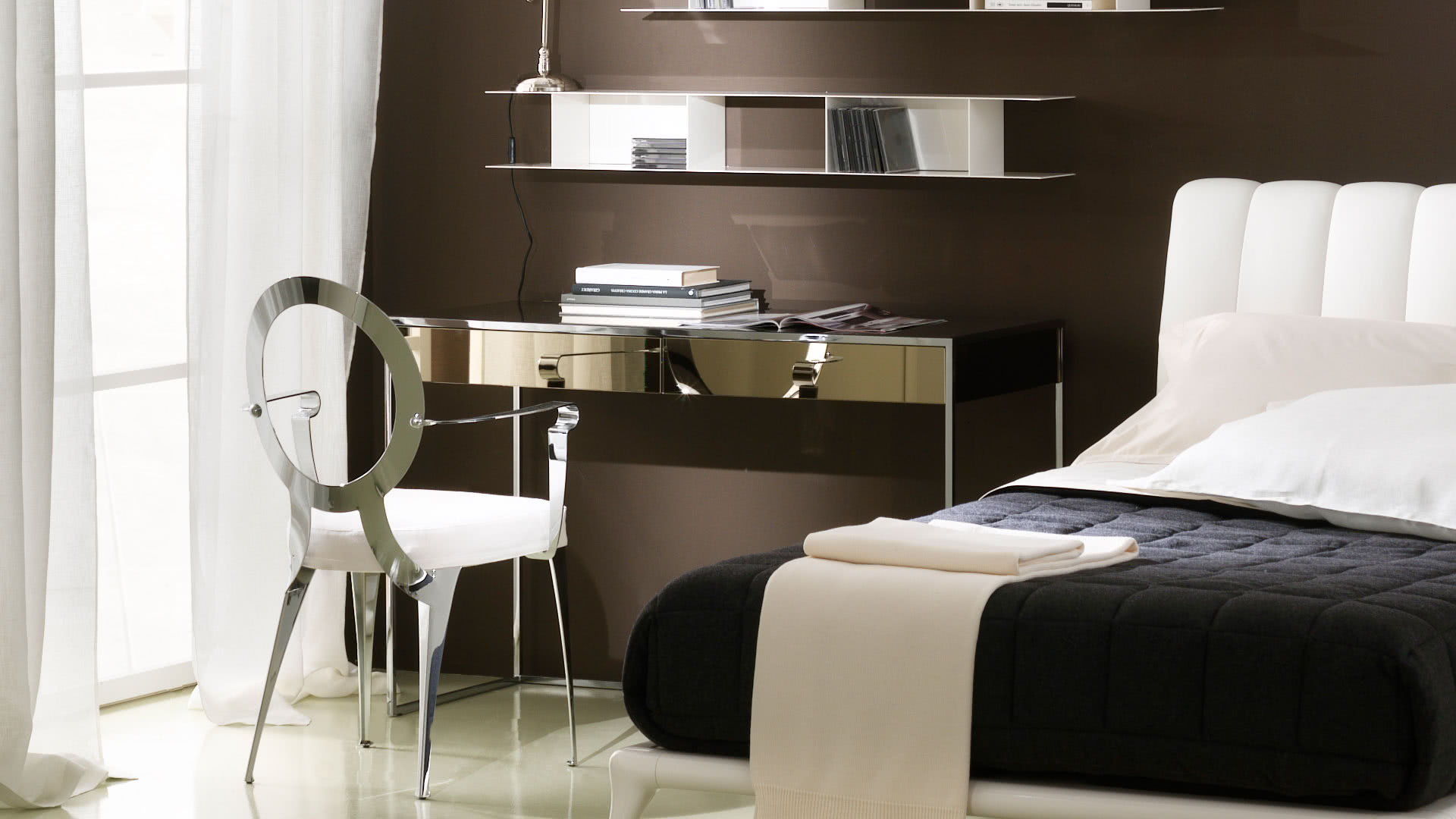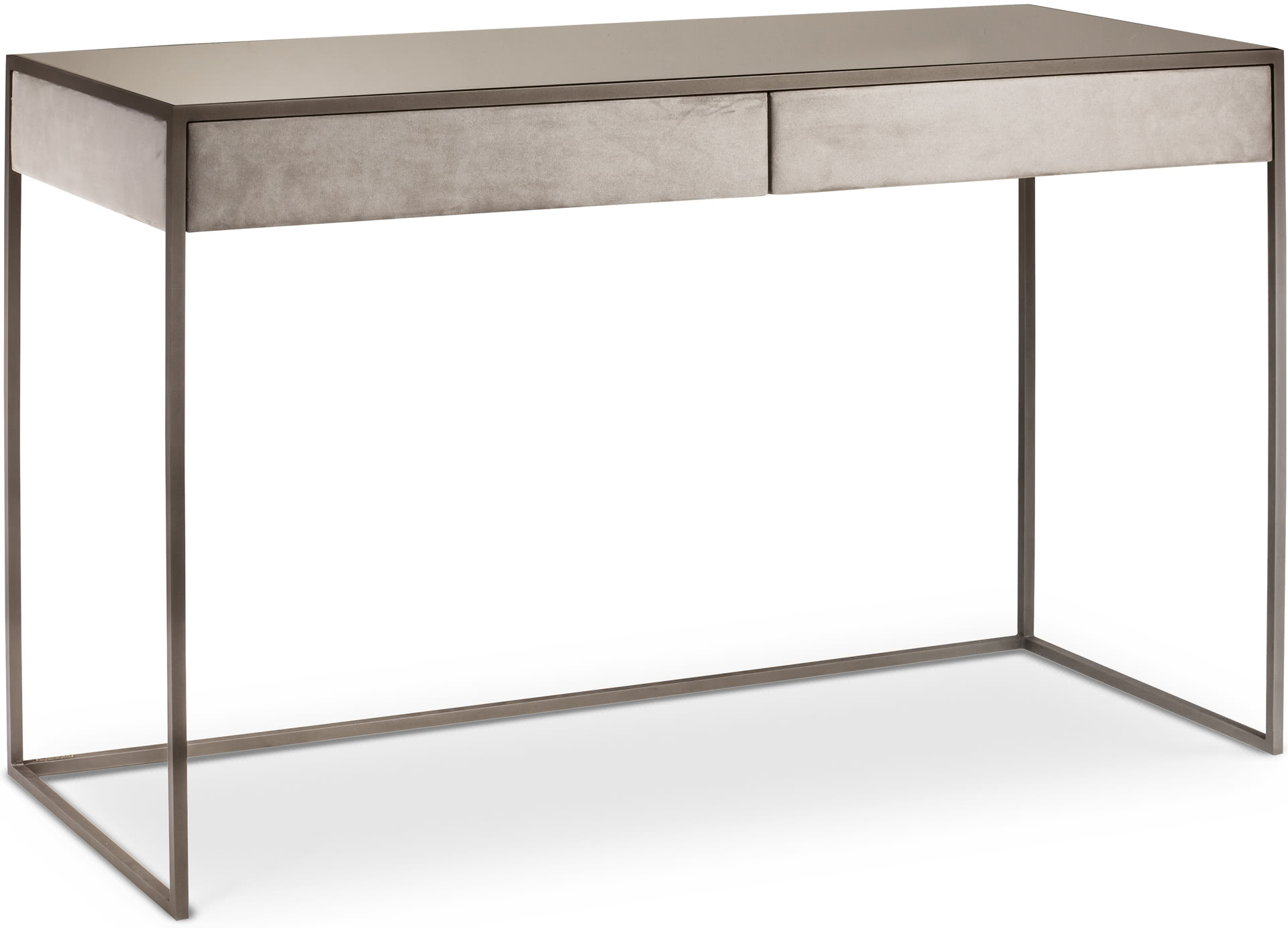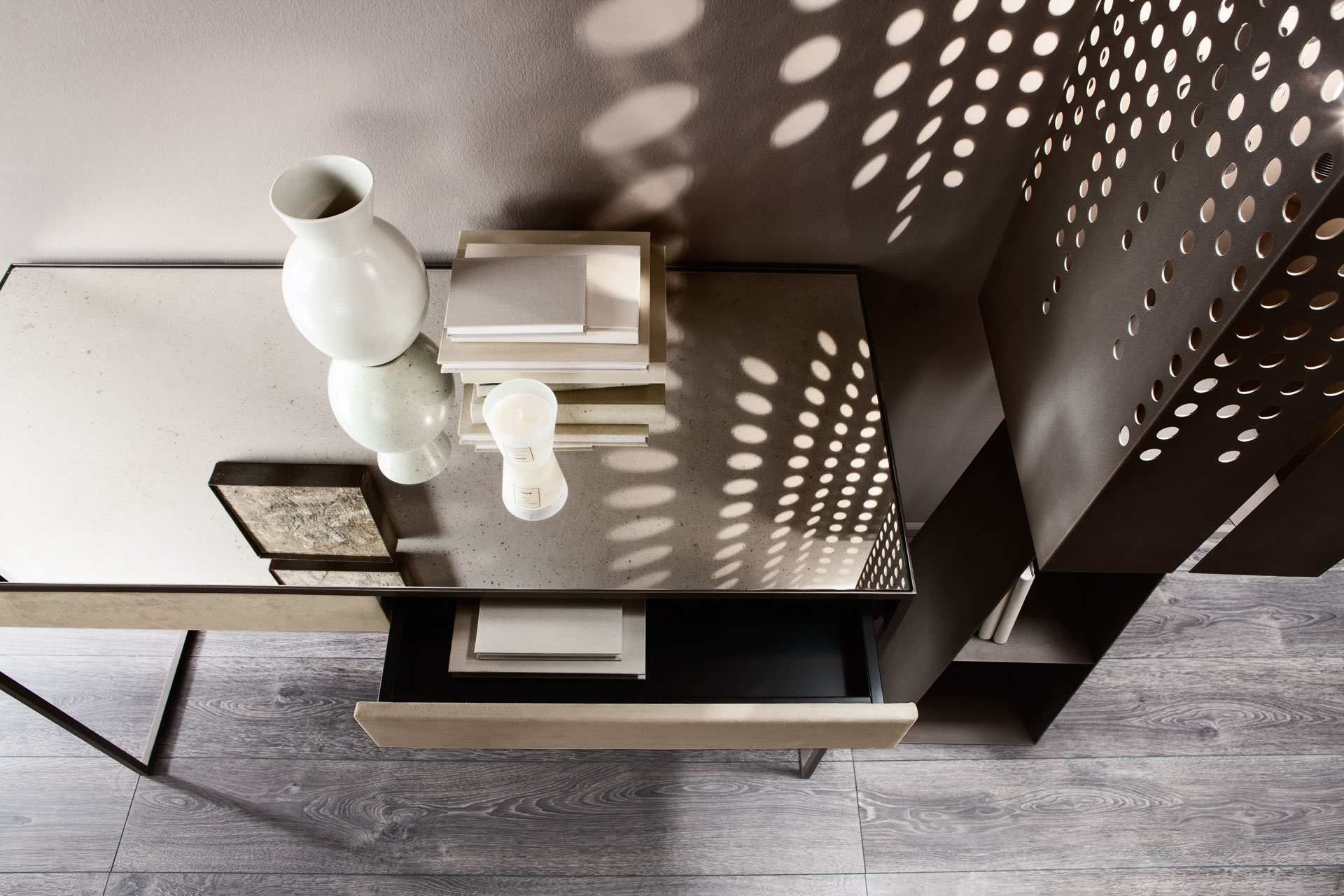La struttura portante in ferro pieno quadro, è disponibile in finitura a bagno di galvanica in bronzo o in ferro metallizzato. Il piano e il rivestimento del cassetto, in legno con guide a richiamo frenato, sono realizzati in specchio fumé bronzo a filo lucido o con rivestimento in tessuto (solo per cassetti).