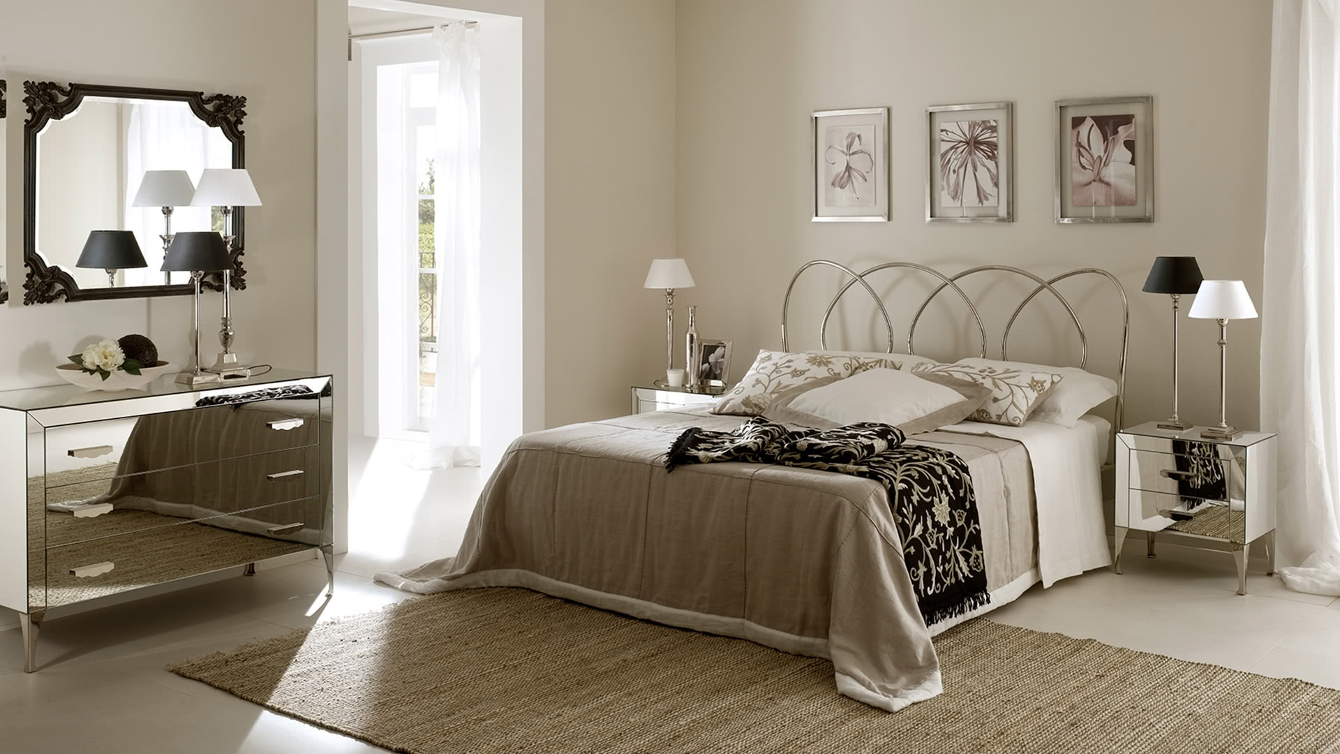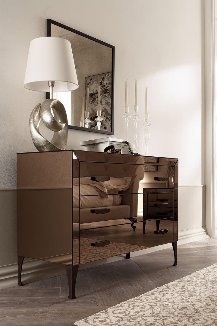 Presenta 3 cassetti con guide ad estrazione totale e richiamo frenato. Tutto rivestito in specchio molato con maniglie e piedi in metallo o in bronzo. Un comò dal sapore vintage che, insieme ai comodini, crea un gruppo notte perfetto anche per una camera da letto classica o vintage.