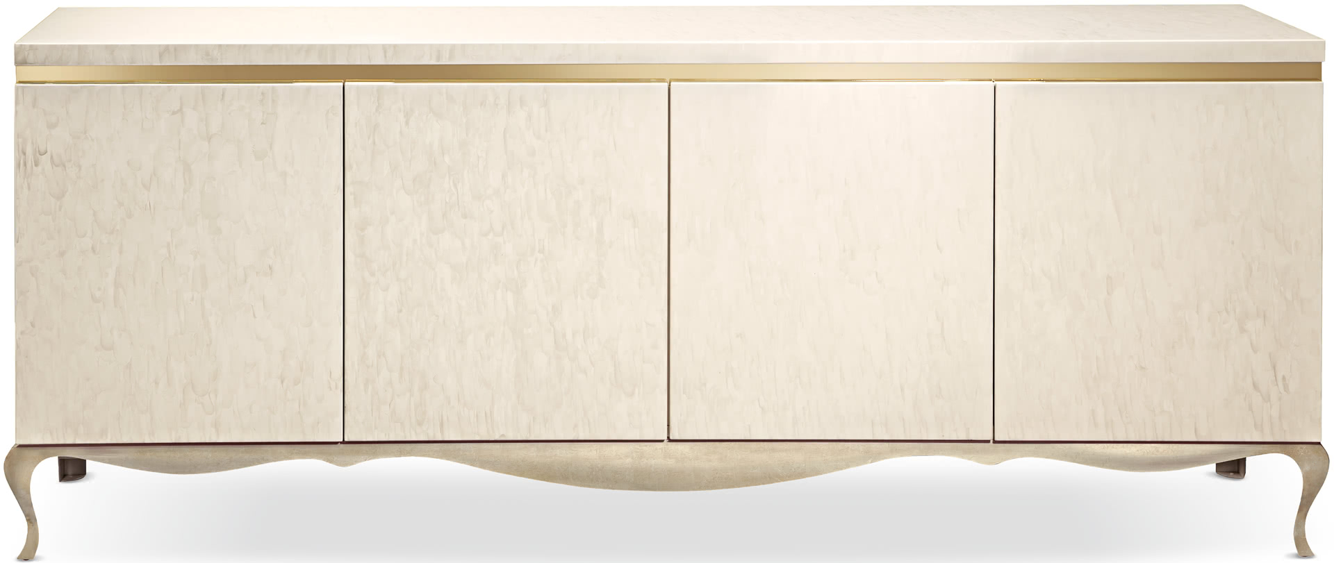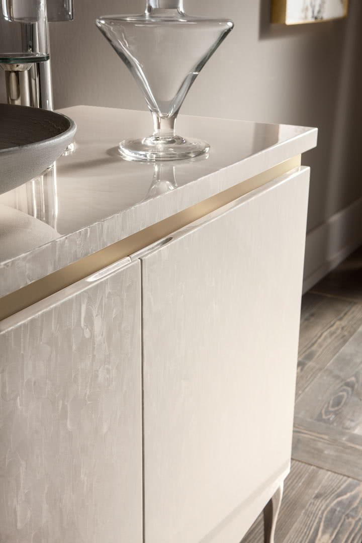 Internamente è divisa con quattro vani, ognuno con un ripiano. La struttura in legno è completamente decorata a mano mentre la base è in ferro, tagliata a laser e saldata a filo, levigata e bombata a freddo. La fascia in oro che divide il top dalle ante mette in evidenza la finitura decorata a mano.