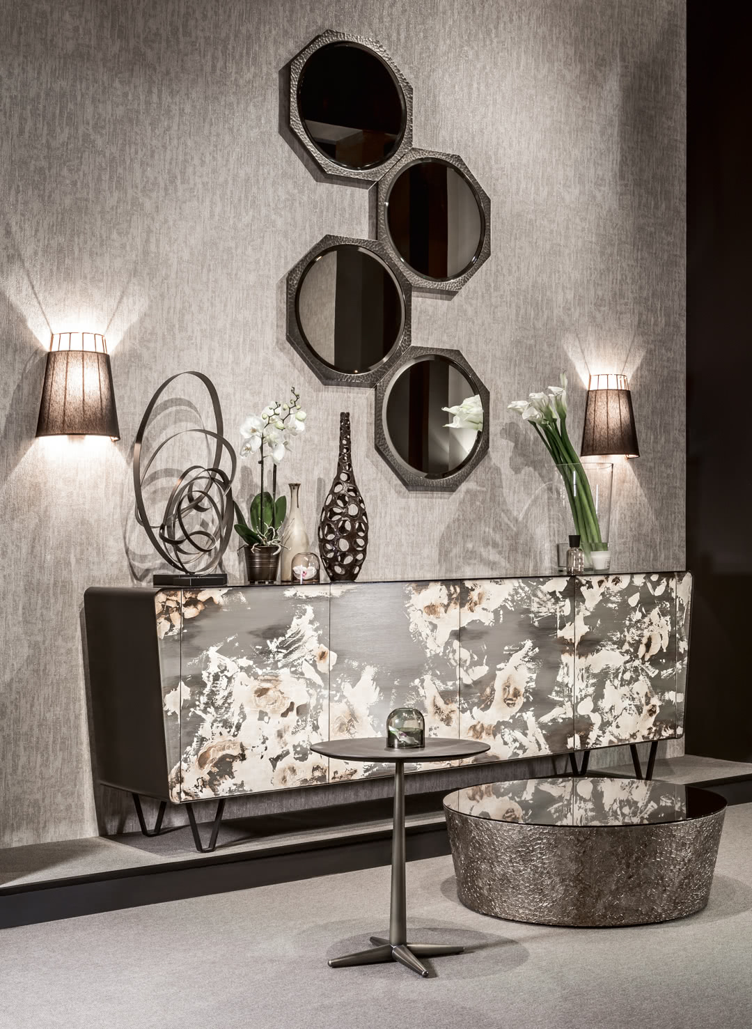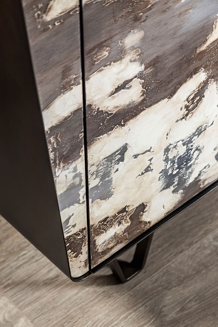 Feet and handles made with shaped steel rod, crystal glass top. The matt lacquered interior can be customized in the colours, while there are three available decorations for the front: "wisteria", "vintage" gold leaf, "storm". The vintage gold leaf decoration is created by hand, applying one entire piece of gold leaf on a dark bronze coat. Although it may seem randomly applied, the decoration is in truth very accurate; the gold leaf is a thin layer laid very gently and with great aesthetic sensitivity, to give the right light between one layer and the other. In the “wisteria” decoration liquid chalk is carefully poured on the light coat. Next step: wisteria flowers and branches are painted by hand on the mother-of-pearl base coat, fllowing the pattern previously created. Chalk, acrylic paint and spatula are the elements of the “storm” decoration: combined together they create an impressive three-dimensional effect.