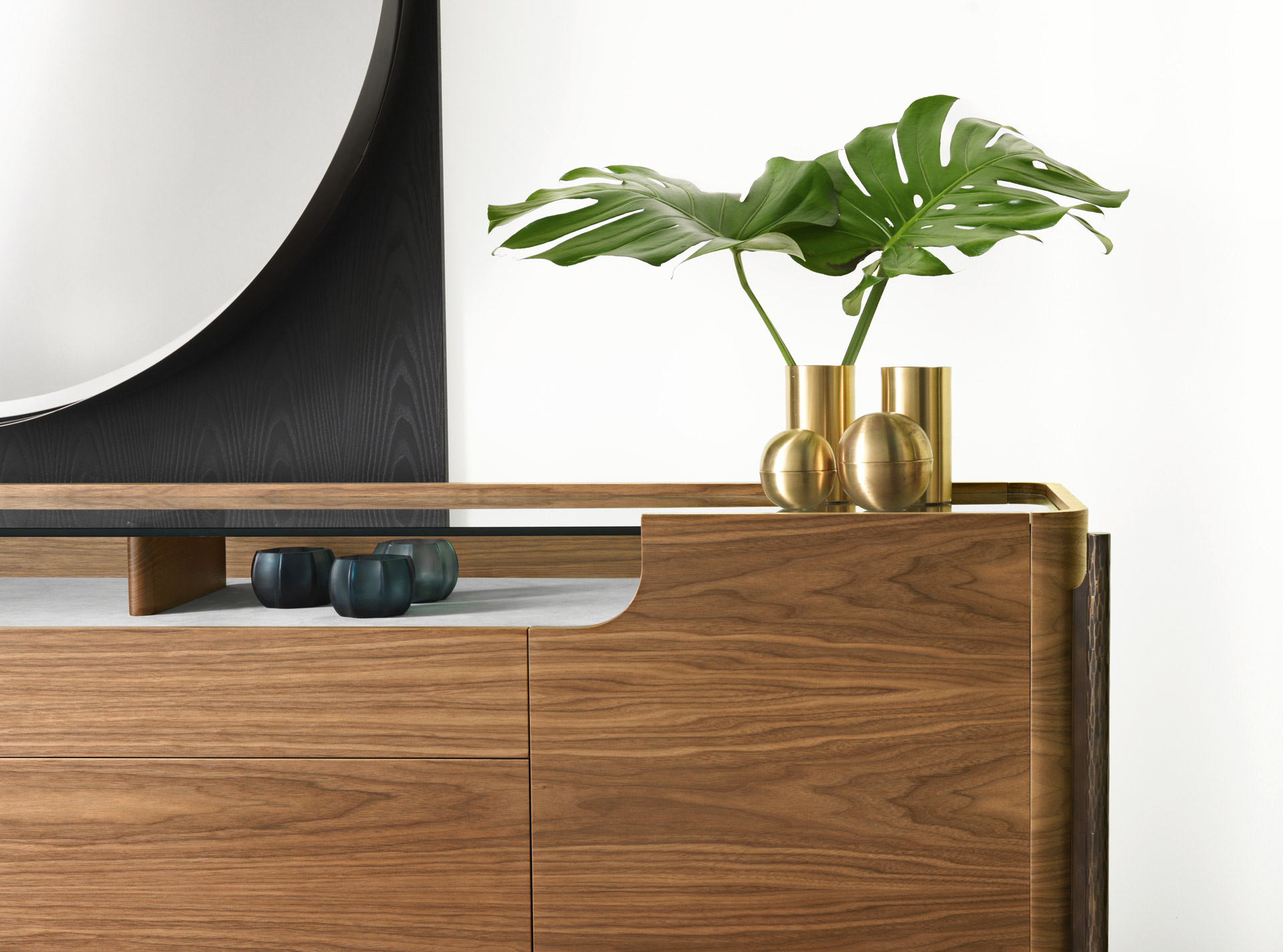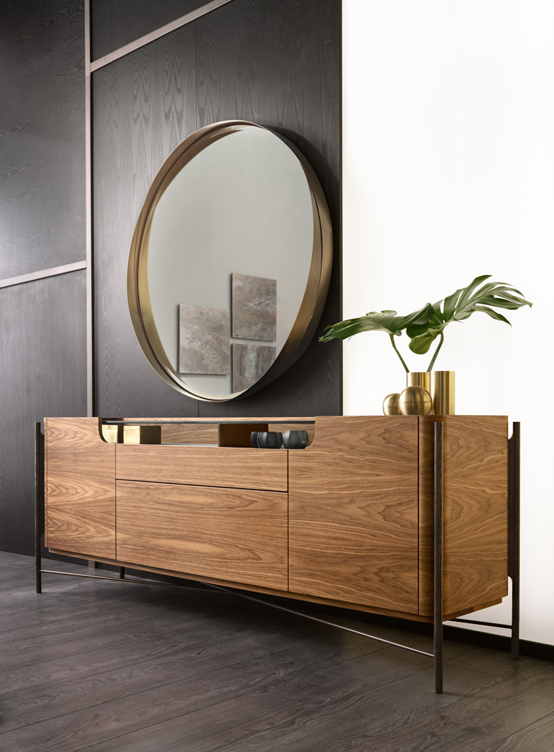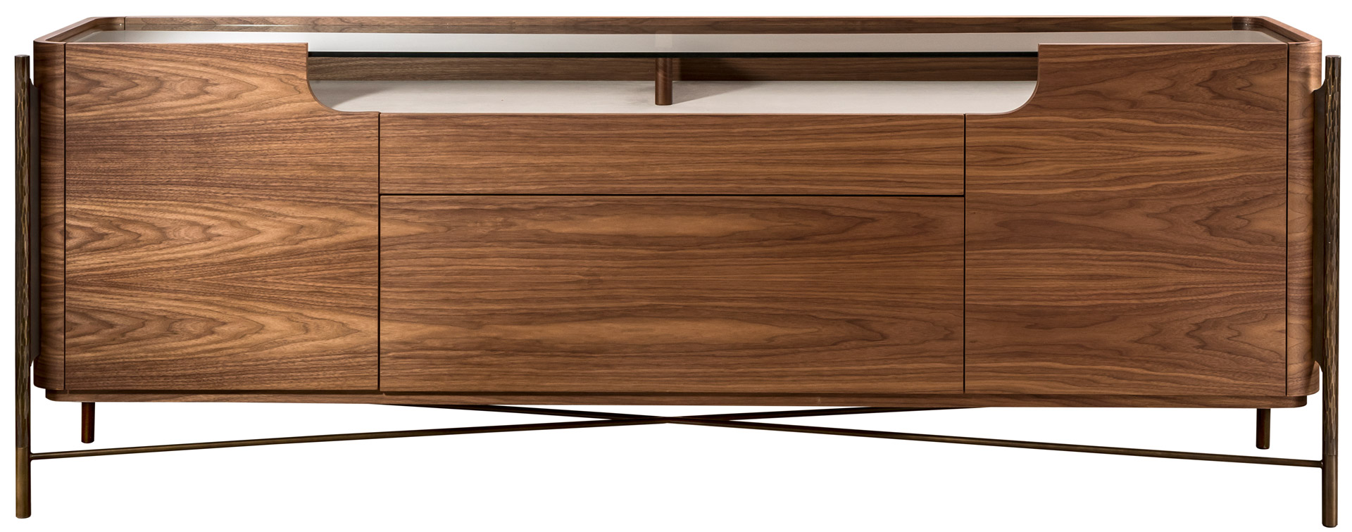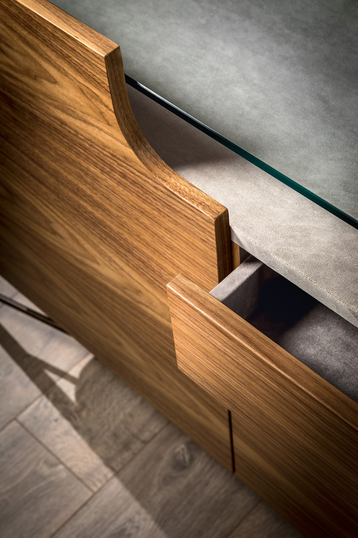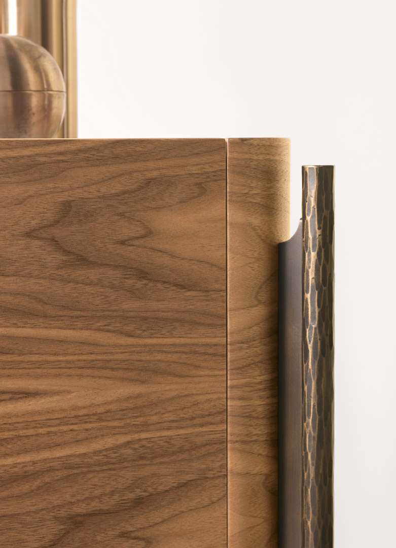 The structure is made of plywood veneered in canaletto walnut wood or black ash wood with vertical supports in forged metal with burnished brass finish, serving as an ideal stand. The glass top and the compartment lined in eco-leather give a refined look to the display unit for collectibles and valuable items. Everything is perfectly matched with the inside parts that are lacquered in ivory colour, creating a harmonious furniture unit. This chest of drawers is originally designed for the bedroom, but it can also be interpreted as a display and storage unit, suitable to be placed in the living area. With its simple and modern lines, it stands out in any setting.
