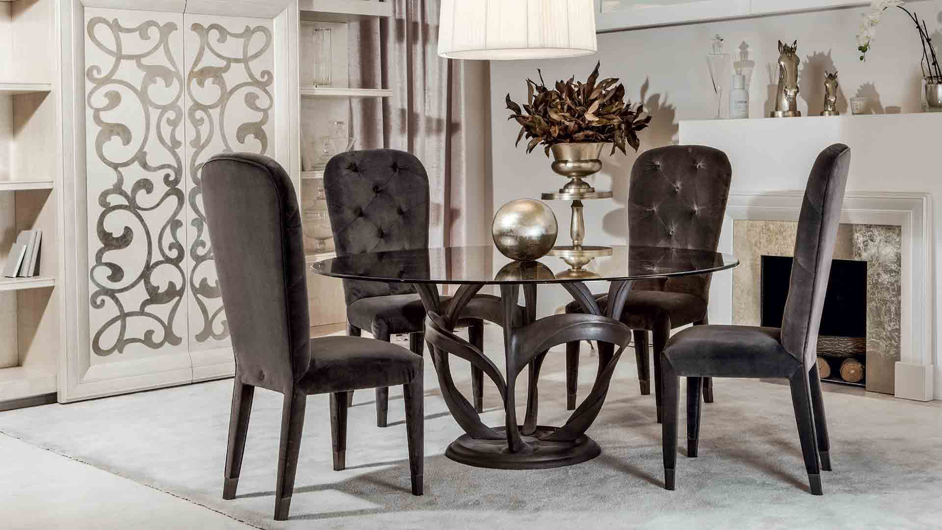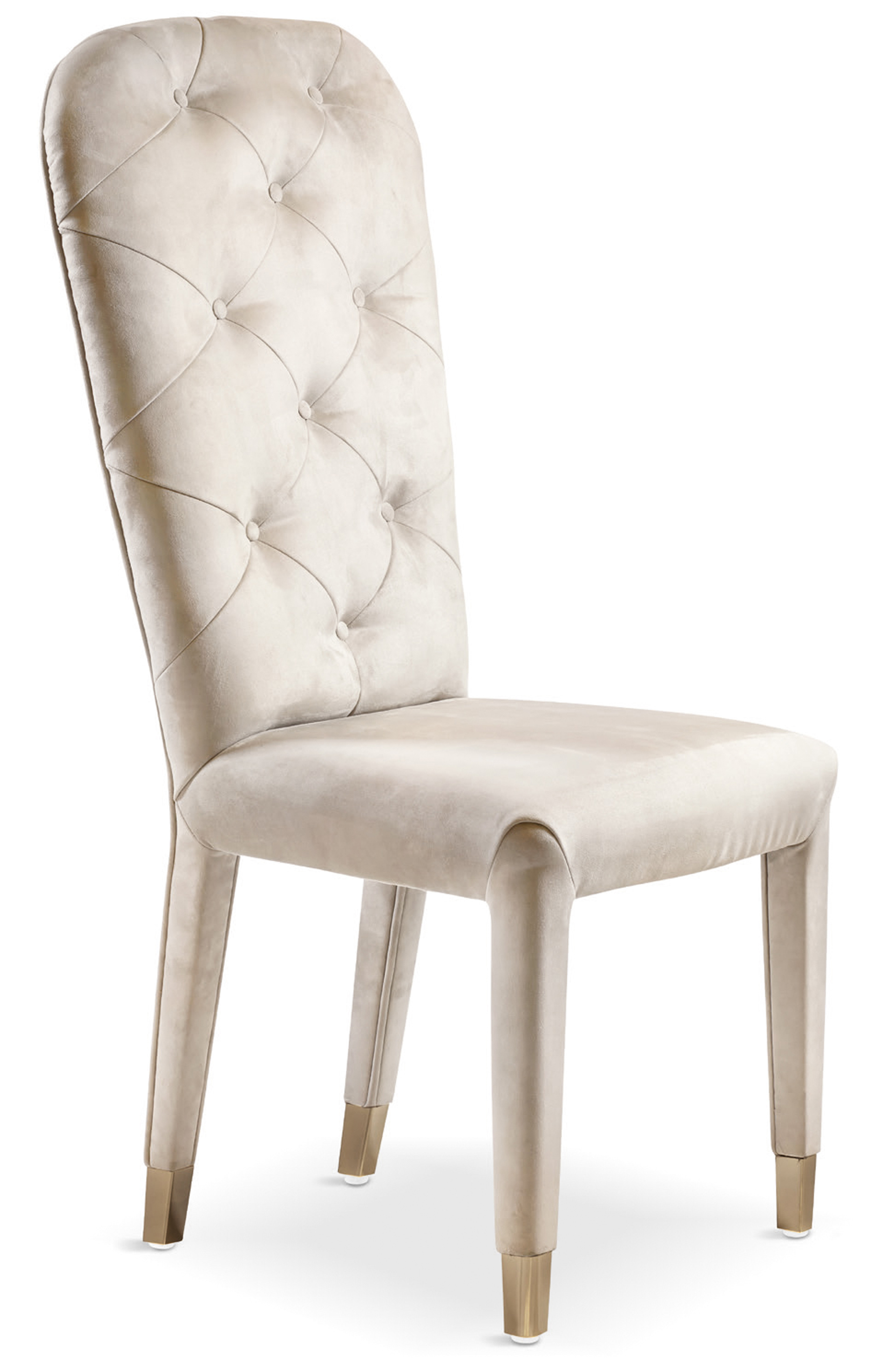 Il telaio in legno massello è completamente imbottito e rivestito. I puntali, estetico-funzionali, sono realizzati in ferro decorato a mano con rivestimento e finitura personalizzabili. La seduta, ergonomica realizzata con un'imbottitura a doppia densità, e lo schienale, lavorato capitonné, possono essere rivestiti in tessuto, velluto, pelle o con un tessuto fornito dal cliente. Una sedia dall’intramontabile stile classico.