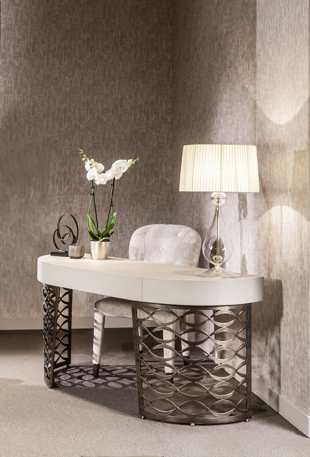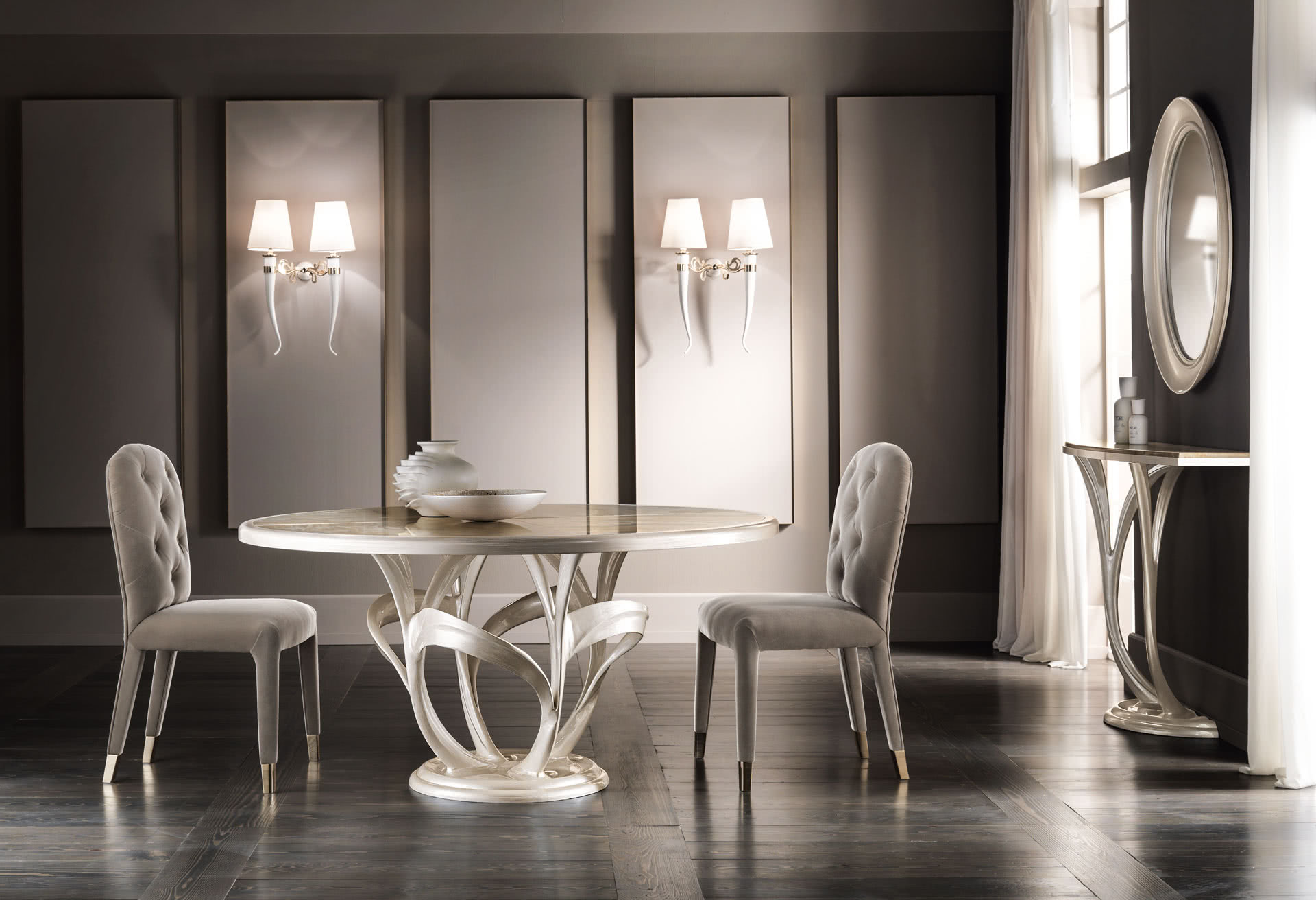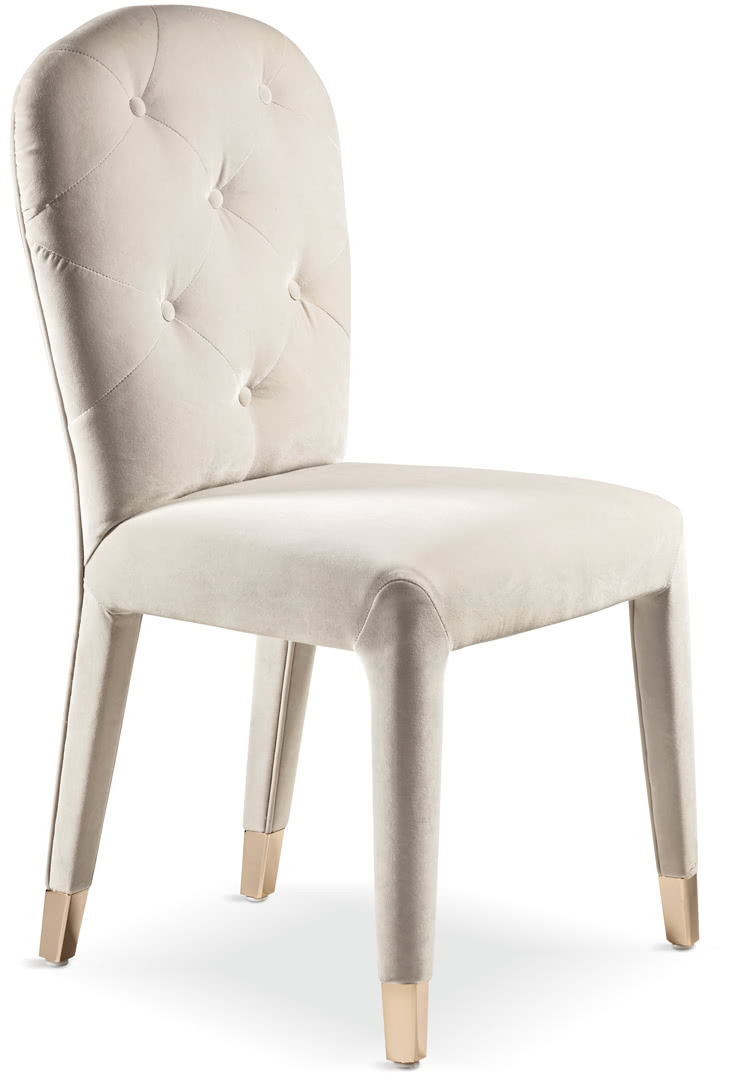 Il telaio in legno massello è completamente imbottito e rivestito. I puntali, estetico-funzionali, sono realizzati in ferro decorato a mano con rivestimento e finitura personalizzabili. La seduta, ergonomica realizzata con un'imbottitura a doppia densità, e lo schienale, lavorato capitonné, possono essere rivestiti in tessuto, velluto, pelle o con un tessuto fornito dal cliente. Una sedia dall’intramontabile stile classico.