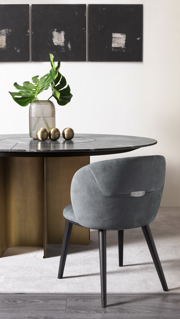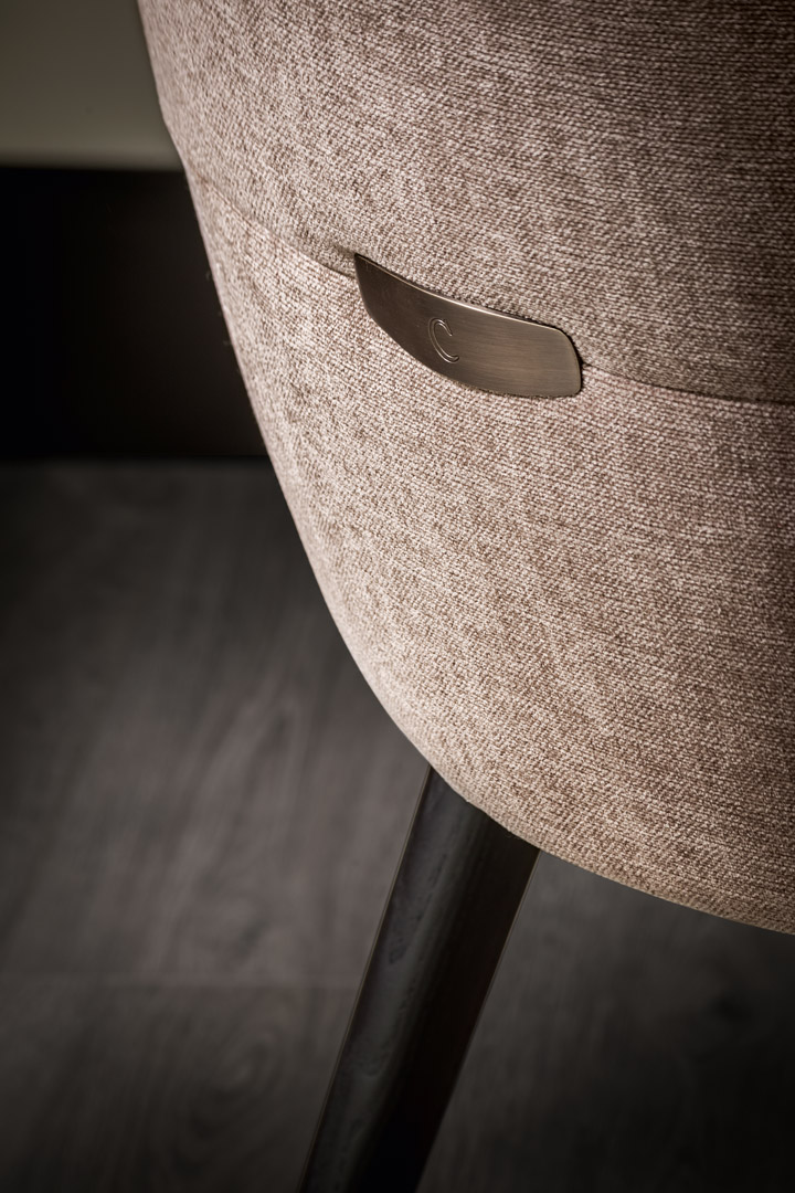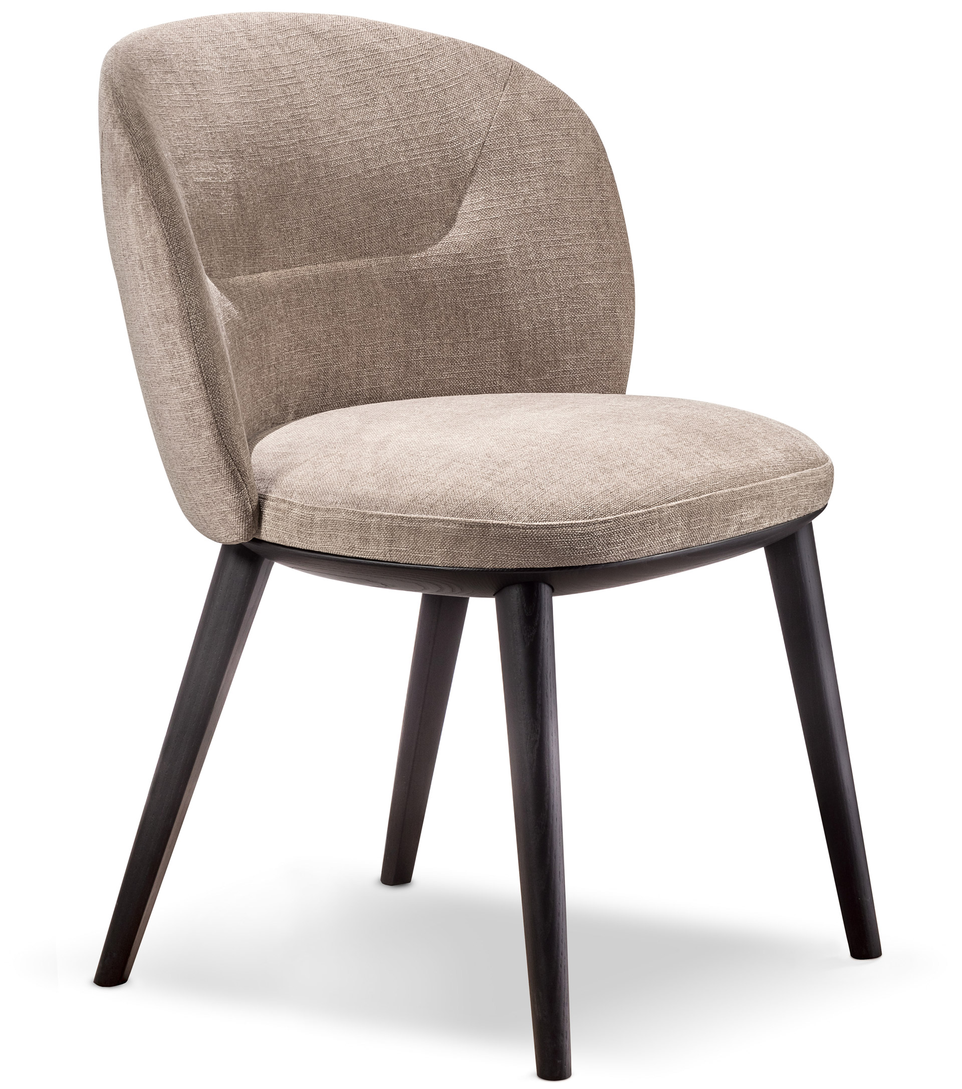 La struttura interna è in legno rivestito in poliuretano espanso a quote differenziate ad alta densità e lo strato superiore ad alta componente elastica. Il rivestimento esterno è personalizzabile in tessuto, pelle o ecopelle. La cura delle impunture dello schienale e il dettaglio in metallo esaltano il design originale. I piedi sono in legno impiallacciato frassino nero o noce nazionale. Le linee avvolgenti della sedia Shiba e la seduta ergonomica assicurano il massimo confort. Perfetta per accompagnare un importante tavolo da salotto.