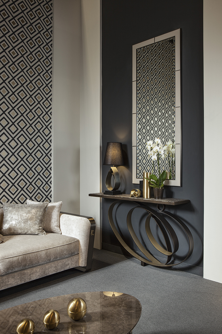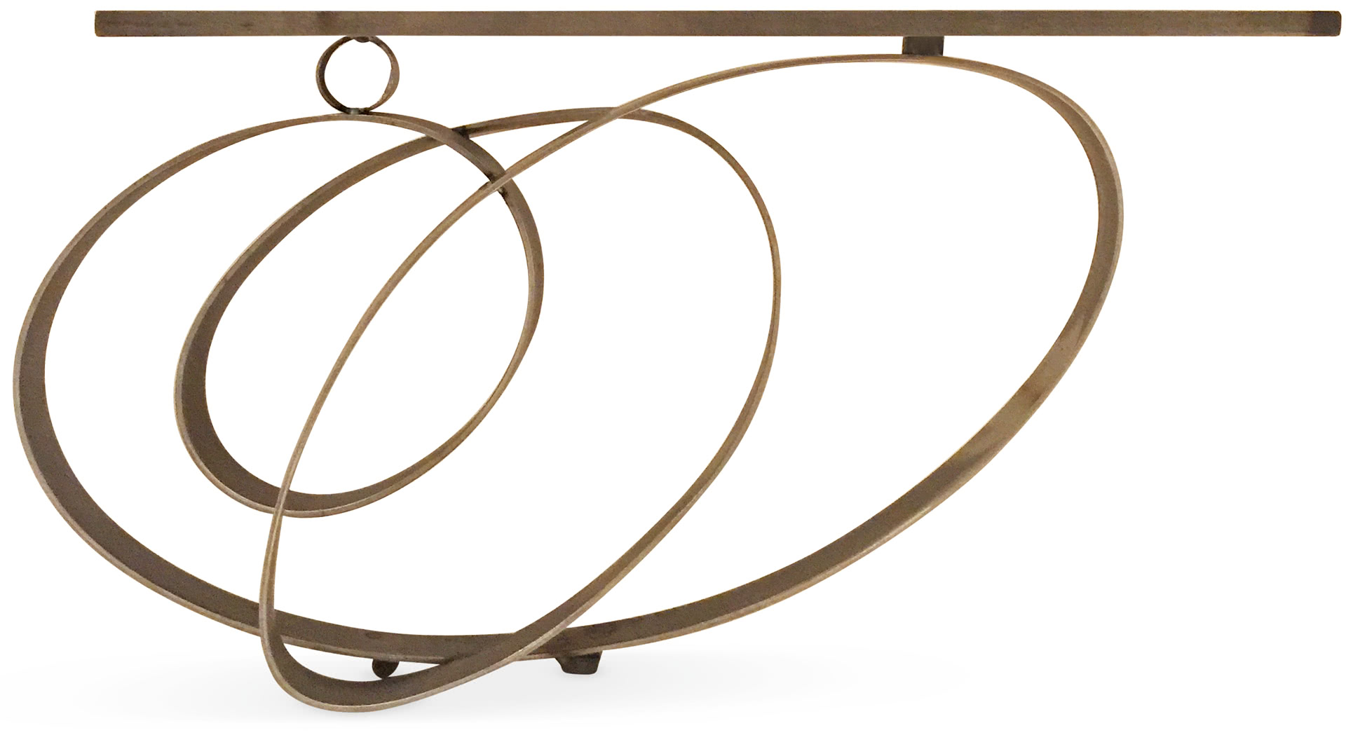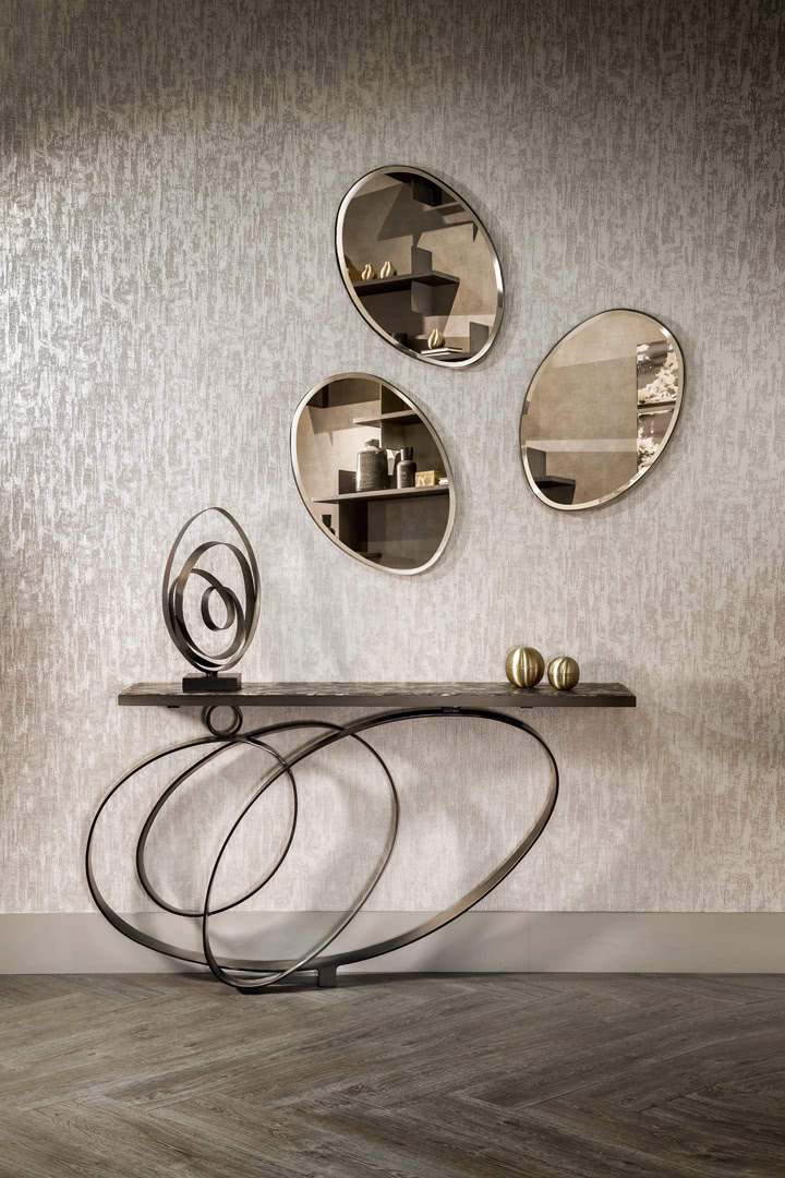 La struttura in ferro pieno curvato, realizzata con una finitura in bronzo o foglia argento champagne, crea un sinuoso gioco di forme che fa risaltare la maestria di Cantori nella lavorazione dei metalli. Il piano in specchio fumé dona luminosità all’ingresso, il piano in marmo la rende elegante e adatta ad ambienti classici, mentre il piano decorato le conferisce un'aria vintage.