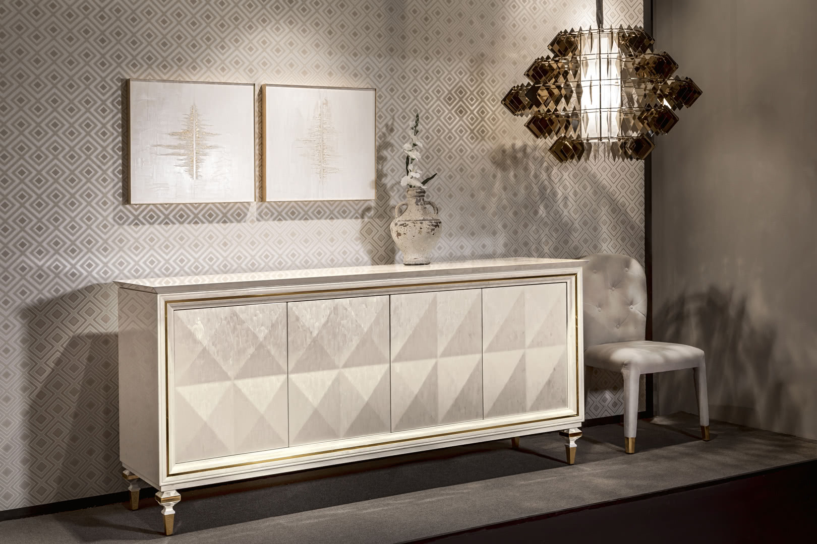 Set di 3 quadri realizzati su pannelli quadrati in legno da cm 55x55 h, da poter posizionare sia in orizzontale che in verticale; la decorazione è realizzata con stucchi e utensili di vita quotidiana come le posate. I colori perlati e la foglia oro creano uno skyline dorato.