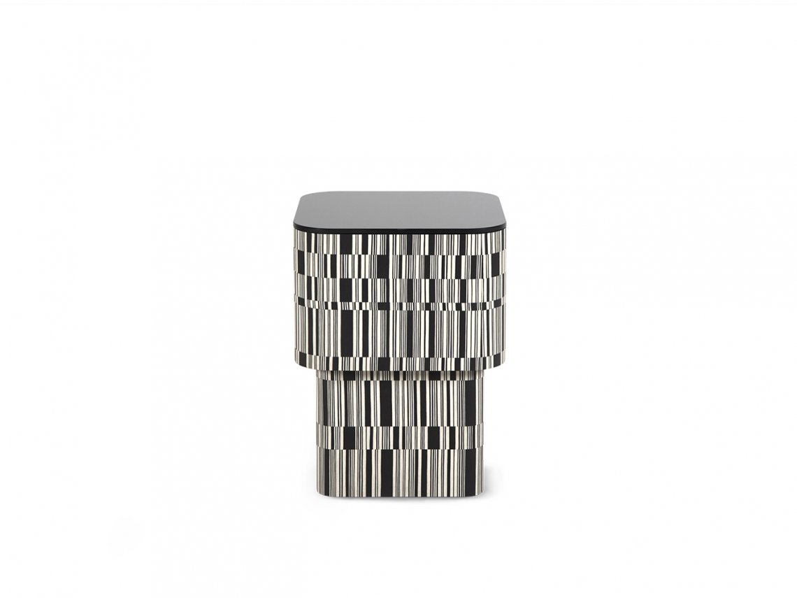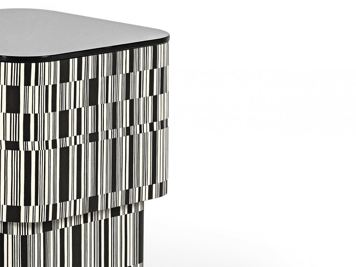 Different shapes and proportions characterize the coffee table collection Enigma. The structure is upholstered with wood, processed with cross-grain inlay with white and black shades that alternate in an irregular way. The Matrix finish of coffee table Enigma is available in matt or shiny version. The black glass top completes the entire structure.