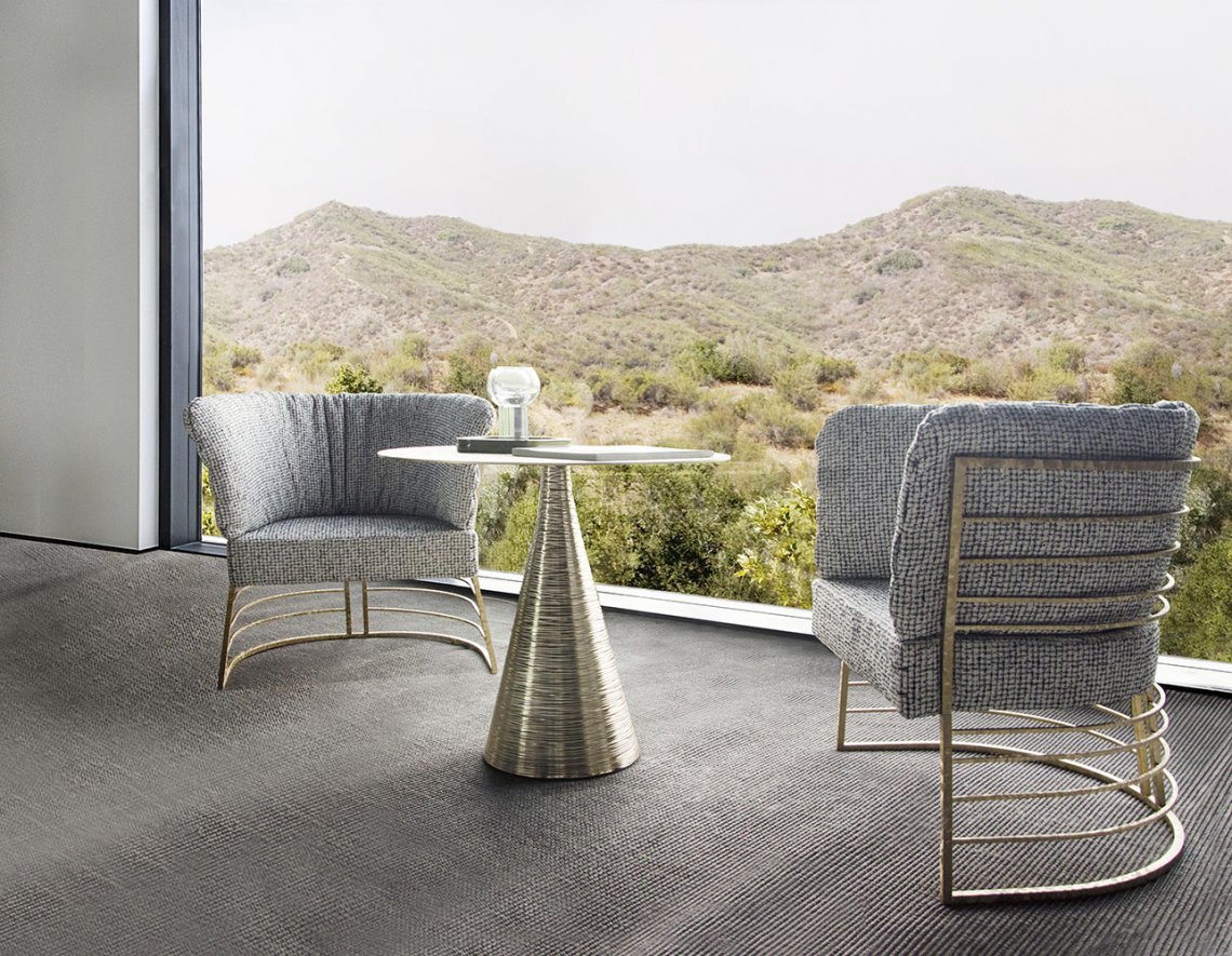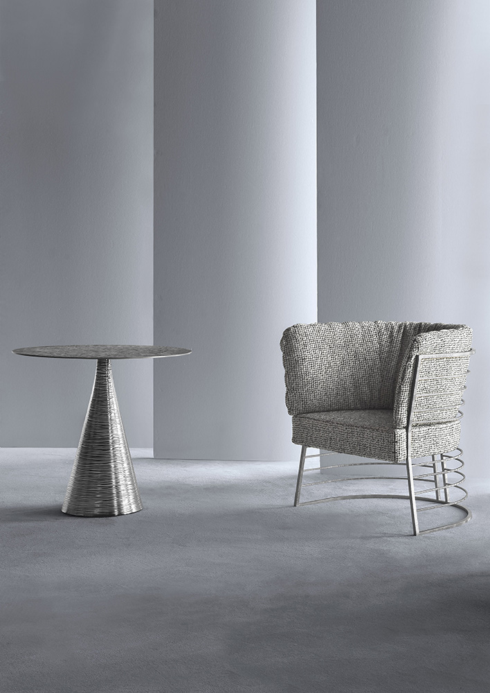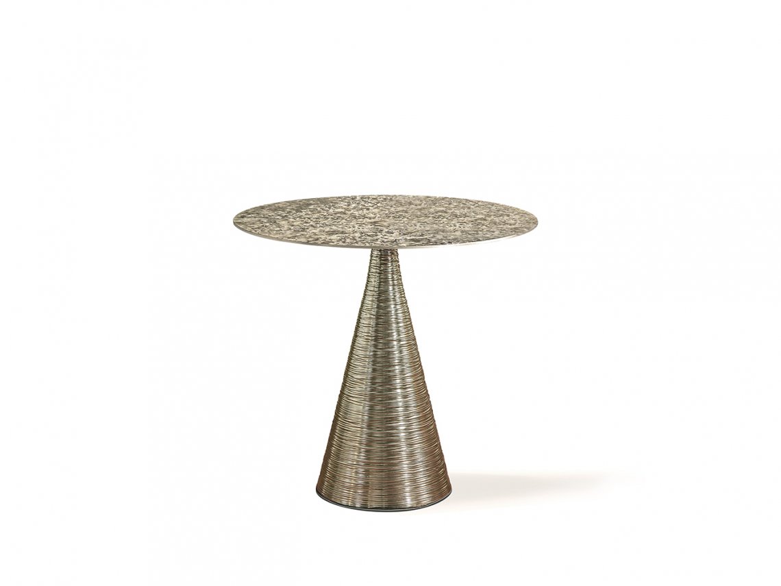 Side table Kevin can be considered a precious element in a living area: its structure is composed by two geometrical figures, a cone for the base and a thin circle element for the top. The metal base is decorated with a modern engraving able to enhance its three-dimensionality while the top is decorated with a refined handmade technique that recalls the manufacture of the Italian jewelry. The height of this piece makes it suitable to be used either as coffee table matched with a couple of armchairs or to be used as a refined side table next to sofas.
