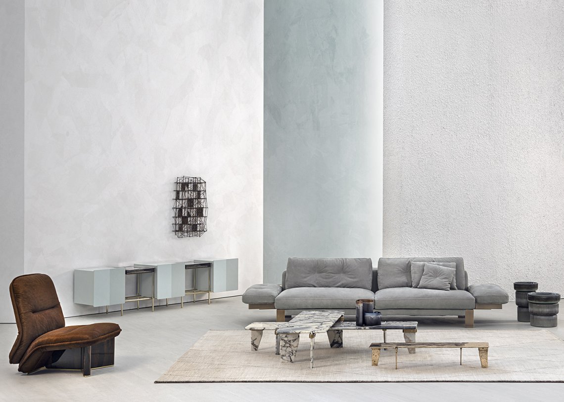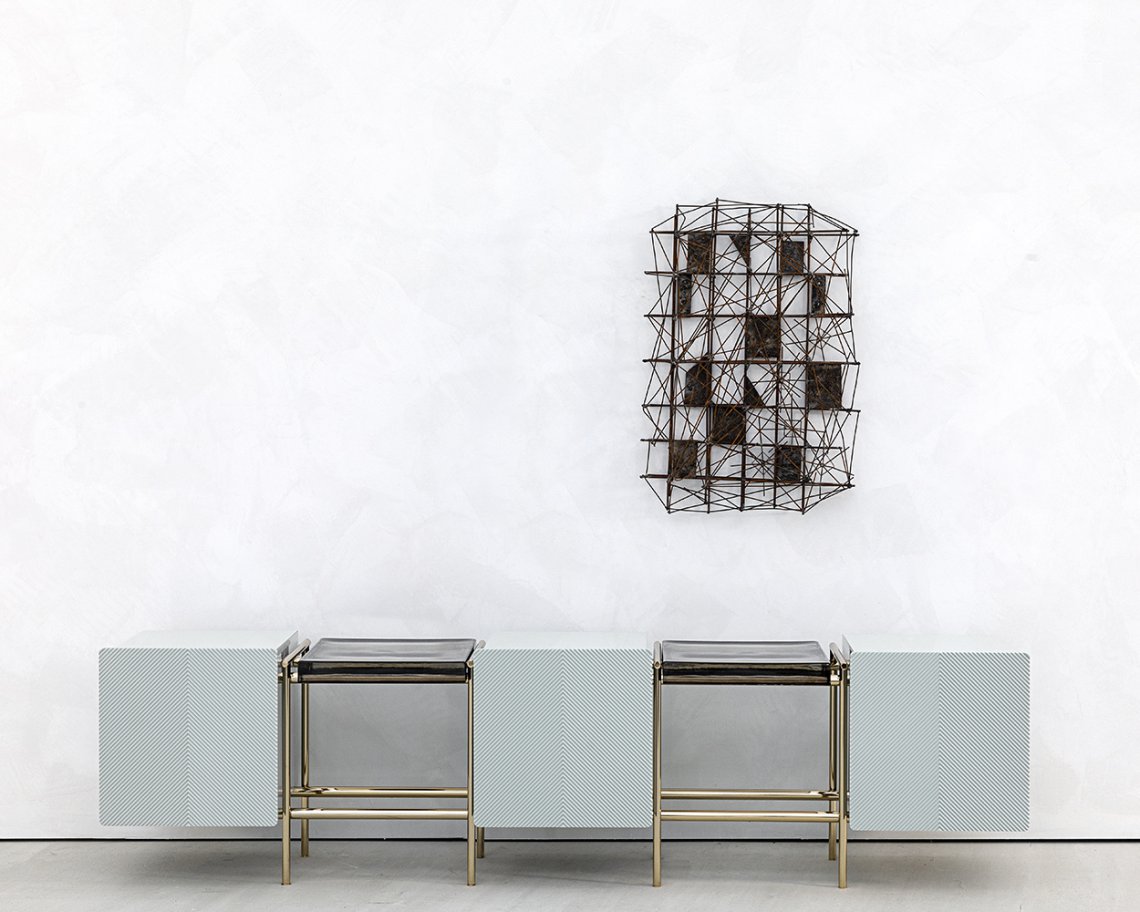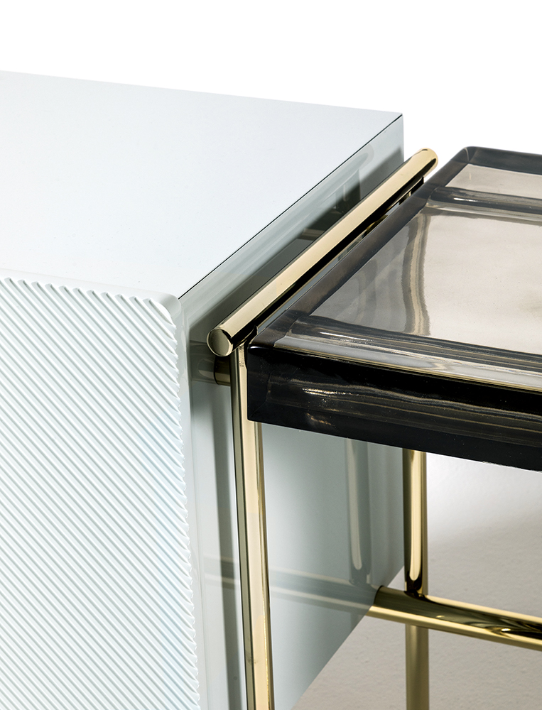 The storage unit Libra is a twist of gold finish metal pipes supporting storage elements and artistic glass shelves. The high craftsmanship emerges from the artistic glass obtained through the casting in plate technique realized by the Master glassmakers of Venice area. The inspiration of storage unit Libra comes from the typical structure of “trabucchi”, small wooden constructions built along the East coast of Italy and used for fishing.