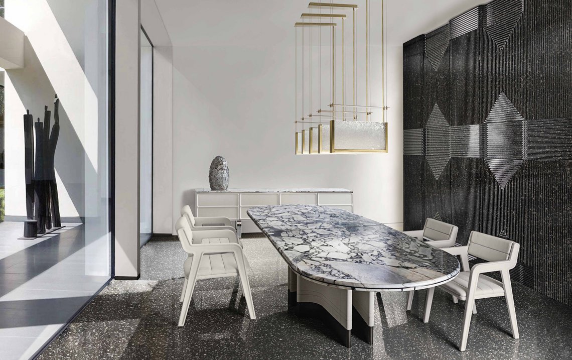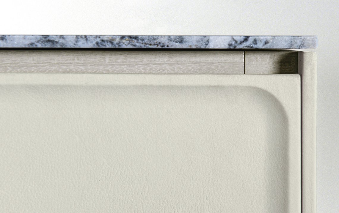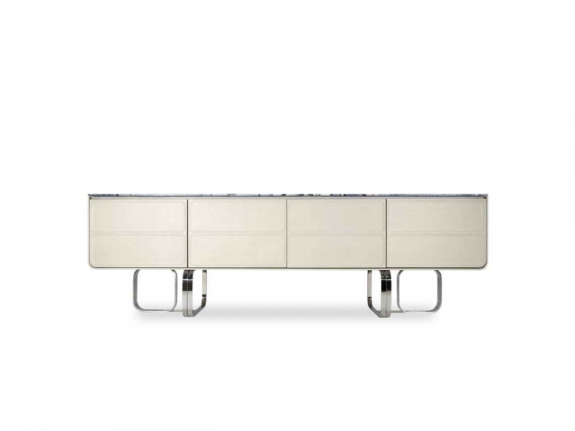 The storage unit Nova with doors and rounded shape is the protagonist of the living area. The care to details is visible on the doors decorated with three-dimensional frames upholstered with soft leather. The structure is supported by two metal bases that characterize the collection while the internal sides are made up of eucalyptus wood.