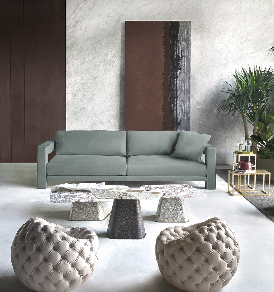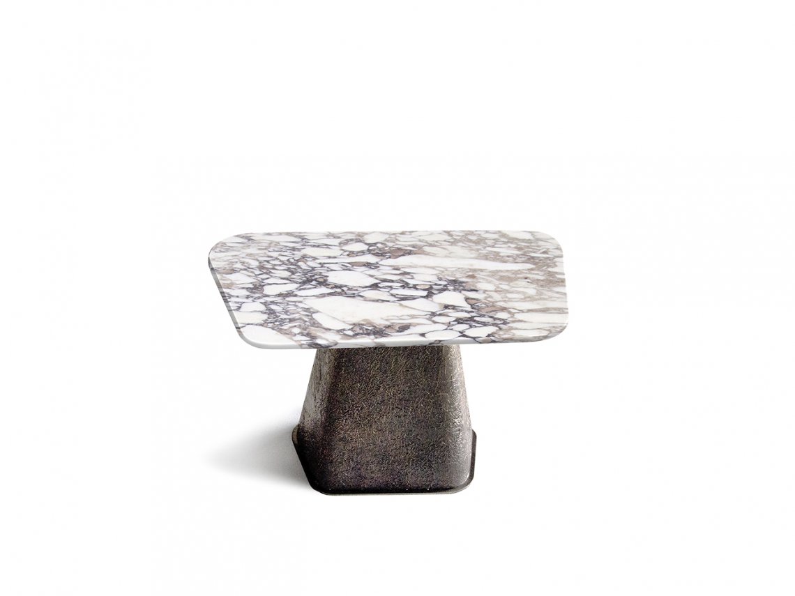 The peculiarity of the coffee table Cheope lies in the eccentric decoration that covers the bases, the designer’s artistic expression. A thin metal sheet is molded thus creating a surface with a strong three-dimensionality emphasized by a chromatic finish that enhances its texture. Available in different chromatic finishes to obtain the best match with the type of “amorphous shape” top in marble. The availability of different sizes allows their use in living areas also in combination with other pieces of different sizes belonging to the same collection.