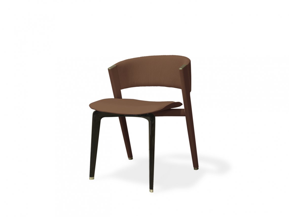 Designed to be matched with Nova table, Lisbona chair is suitable also for other tables placed in different living areas: the look of this item is refined and its proportions have been thought to grant the best comfort. The front legs are realized with maple tree wood lacquered with dark brown colour while the frame and back legs upholstered with leather, present refined brushed metal details on the upper part. The back legs,a bit reclined internally, sustain an enveloping leather back embroidered with “plissè” effect while the seat, that is upholstered too, exalts the shape of this chair showing the cross detail that joins the legs.